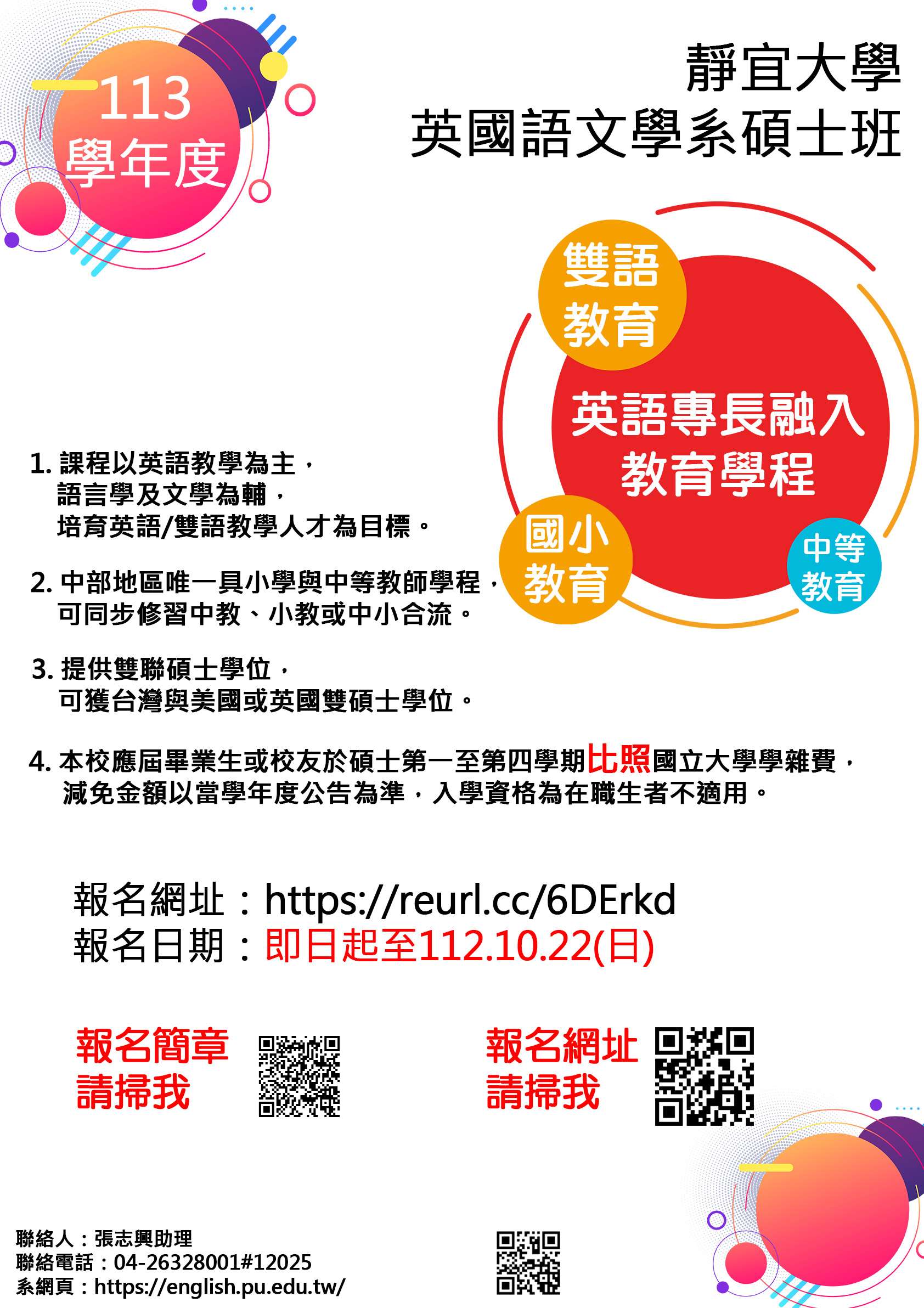 一、本校英國語文學系113學年度碩士班甄試入學招收一般生和 在職生共5名。