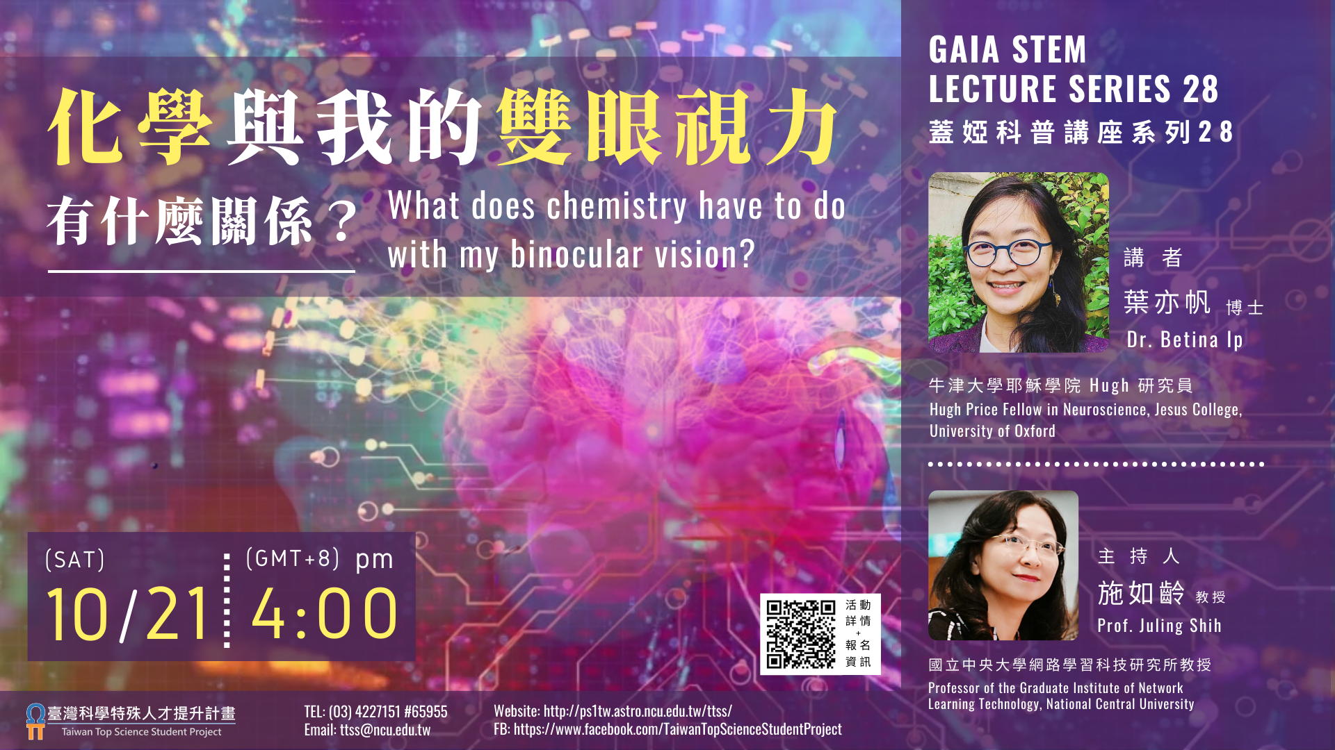 國立中央大學訂於112年10月21日辦理線上講座:《蓋婭科普講座 系列28》—「化學與我的雙眼視力有什麼關係?」,請師生踴躍報名參加(如附檔)