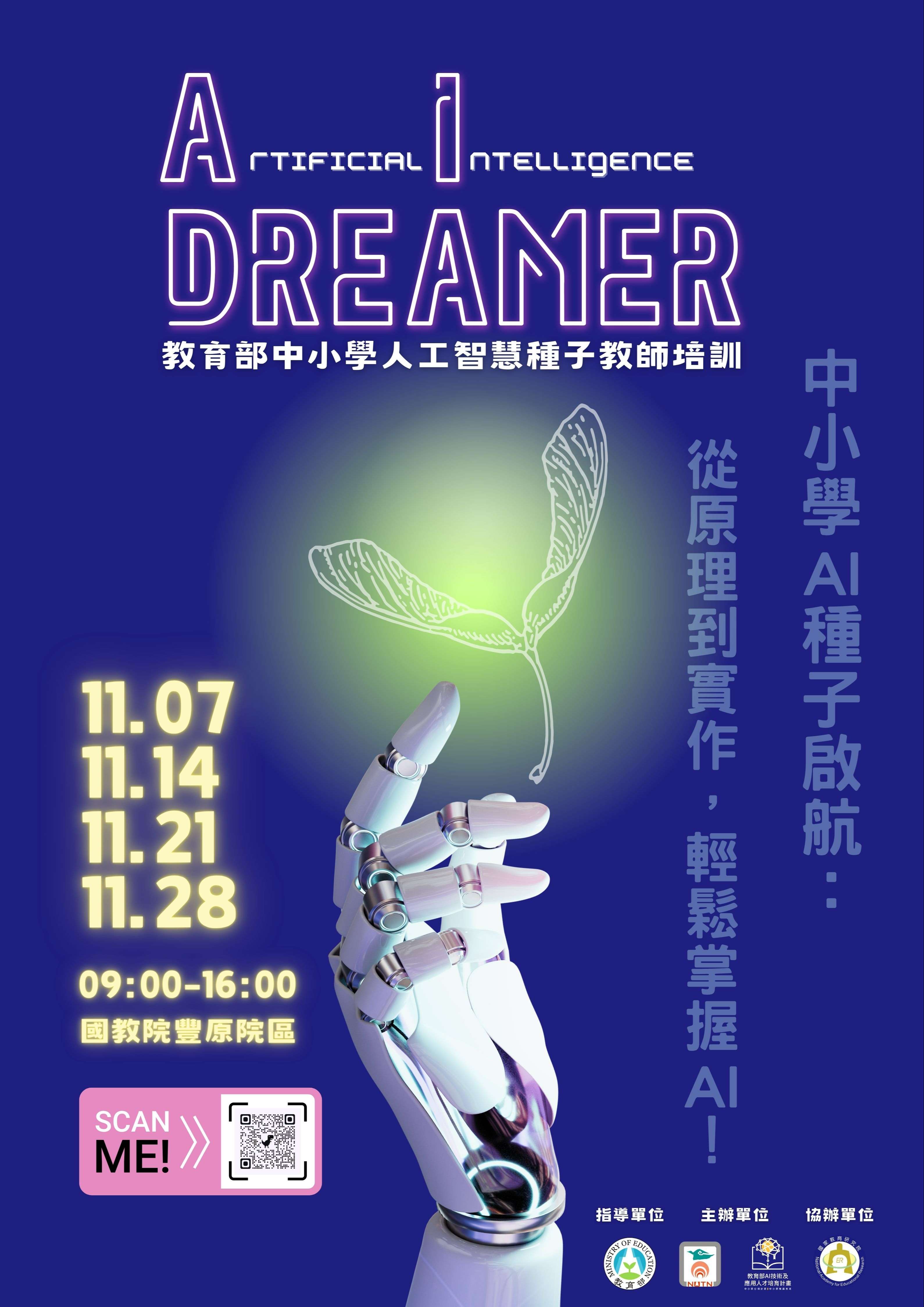 (一)教育部人工智慧人才培育計畫,為培訓中小學校實施 人工智慧(Artificial Intelligence; AI)教育的種子教師,台南大學特辦理教育部中小學AI教育種子教師「AI Dreamer」 培訓,報名參加之教師需完整參與4次培訓課程,並通過課 程小測,且於完成課程培訓後拍攝教學實施影片,經專家 委員審核通過後取得AI種子教師資格。
