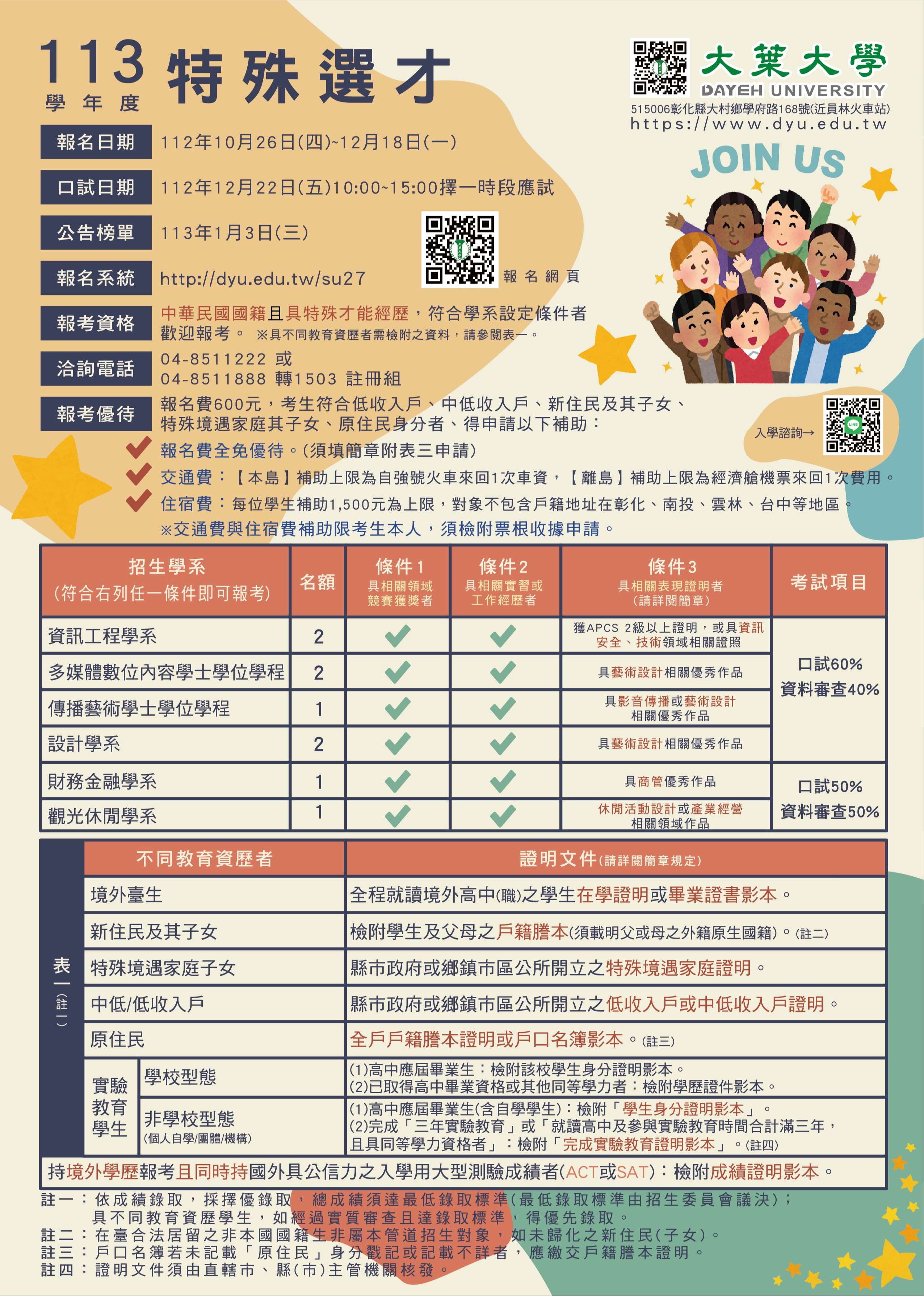 五、各系報考資格,請參閱招生文宣並詳閱招生簡章資訊。考生符合「低收入戶、中低收入戶、新住民及其子女、特殊境遇家庭子女或原住民身分者」,另有免報名費或交通與住宿費之補助,敬請師長踴躍推薦所屬學生報考。
