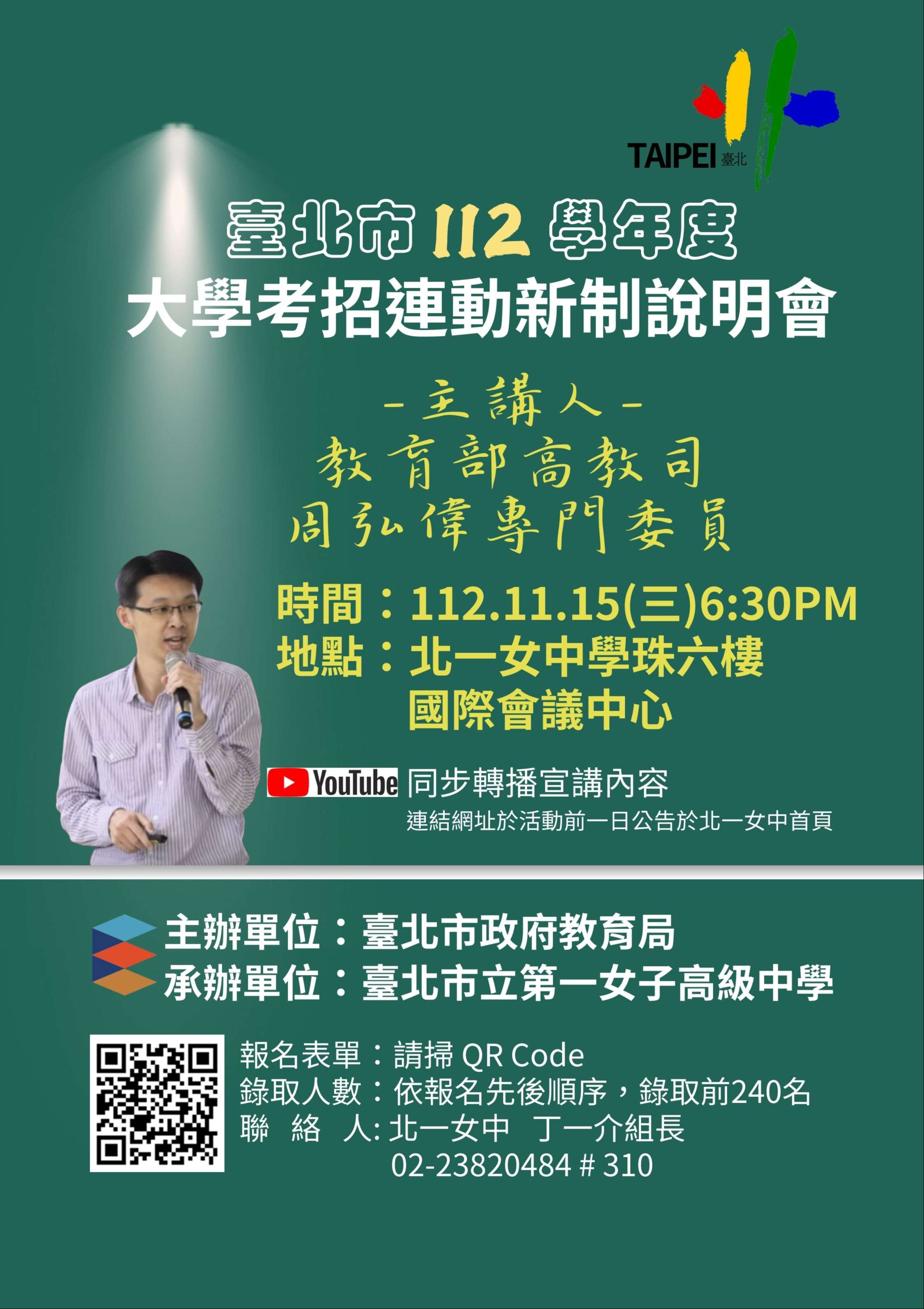 1、本說明會採實體方式進行,主要宣講內容「大學考招連動新制說明」同步經由Youtube轉播,相關連結於活動前1日公布於北一女中網頁(https://www.fg.tp.edu.tw/)。