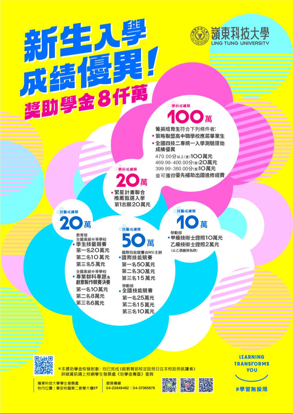 一、嶺東科技大學113學年度特提供新生入學成績優異助學金方案計新台幣捌仟萬元。