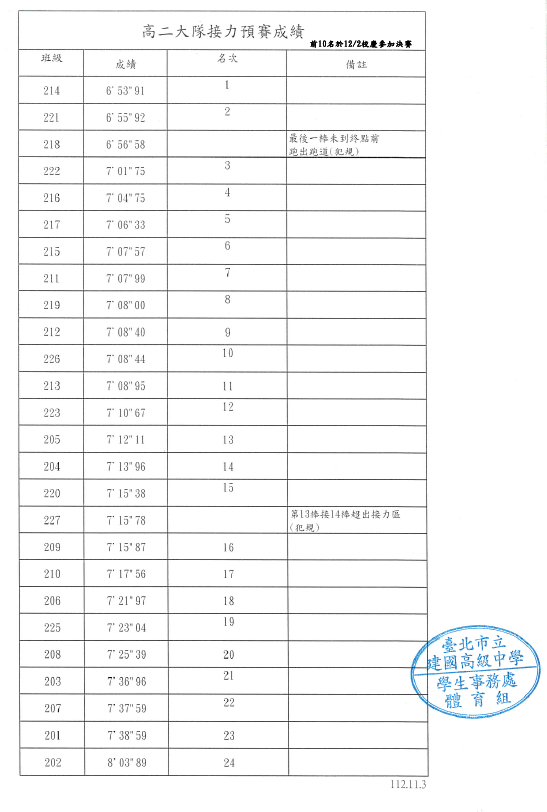 高二大隊接力預賽競賽成績如附件,前10名班級將於12/2校慶參加決賽。