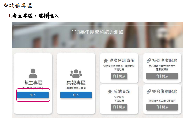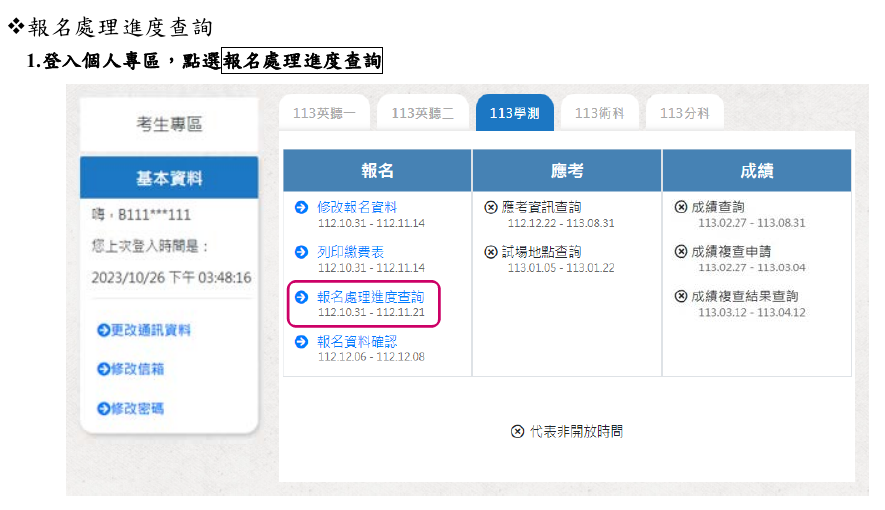 考生可至大考中心網站 113 學科能力/高中英語聽力測驗「試務專區」之「考生專區」(應屆考生請先註冊),查詢報名處理情形與檢視報名資料。如發現姓名、考試地區及無冷氣試場等項目,有任一項與原報名資料不同者,務請於11月13日下午1時前,向教務處註冊組提出。