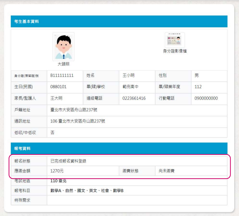 註:因校內匯款流程尚未完備,故每位考生之繳費狀態將顯示為尚未繳費,本校預計於11月14日中午前完成繳費流程。