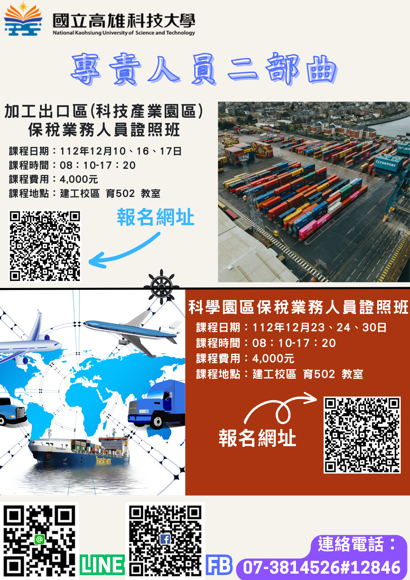 (一)加工出口區(科技產業園區)保稅業務人員證照班:112年 12月10日至112年12月17日,報名網址:http://pse.is /58vvwy,課程費用:4,000元。