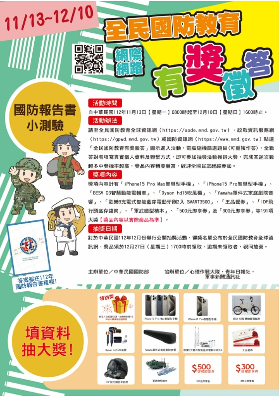 自11月13日(星期一)0800時至12月10日(星期日)1600時止,請參加者進入全民國防教育全球第 1 頁,共 6頁資訊網(https://aode.mnd.gov.tw)、政戰資訊服務網(https://gpwd.mnd.gov.tw)、國防資訊網(https://www.mnd.gov.tw)及國軍內部網路,點選「全民國防教育有獎徵答」圖示,系統隨機篩選9題(可重複作答),全數答對者在網站留下個人基本資料與聯繫方式,即可參加。