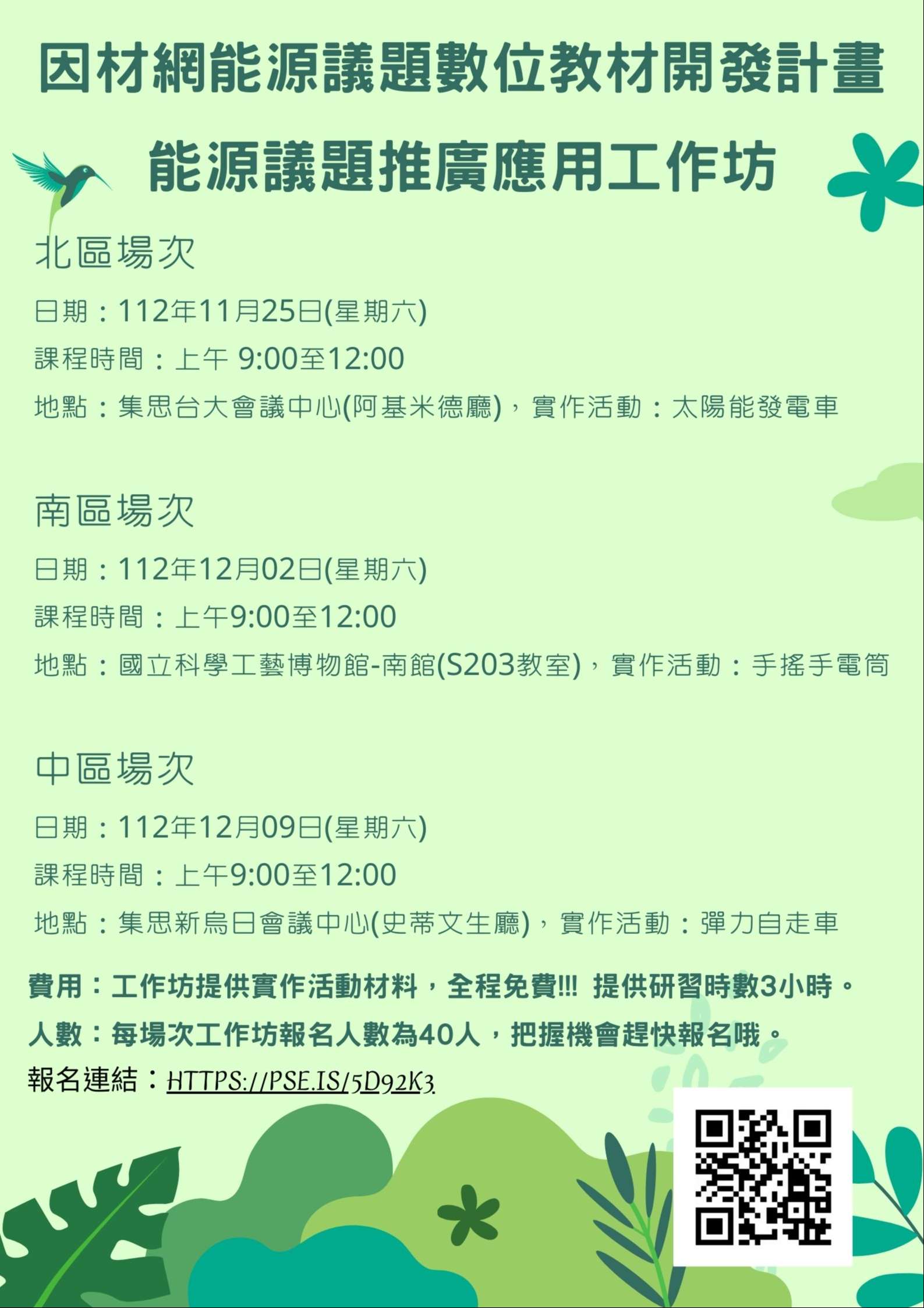 三、報名資訊:每場次工作坊報名人數上限為40人,請把握時 間報名;報名連結:https://pse.is/5d92k3,不接受現場 報名。
