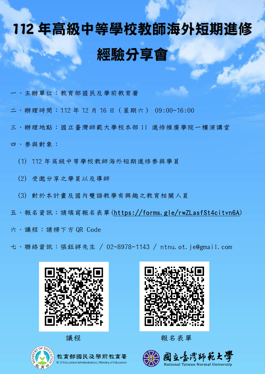 二、旨揭分享會訂於112年12月16日(星期六)於國立臺灣師範 大學圖書館校區進修推廣學院一樓演講堂辦理,報名網 址:https://forms.gle/rwZLasfSt4citvn6A(聯絡資訊: 張鈺祥先生/02-8978-1143)。