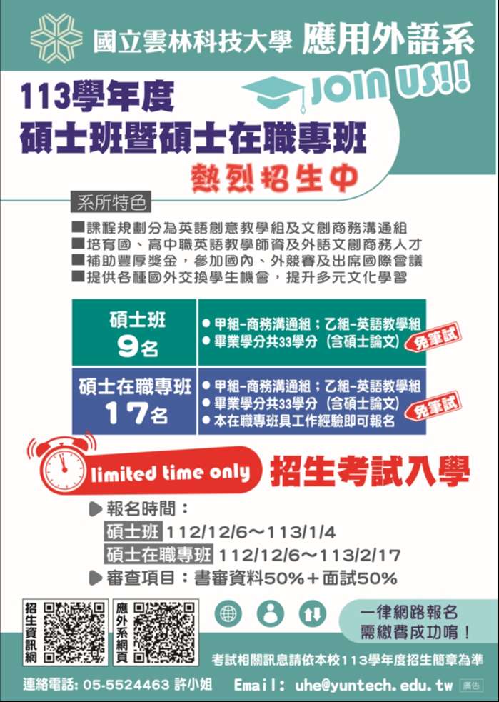 (三)應用語言學與英語教學:113年2月24日至113年6月22 日,每週六下午1時10分至4時。