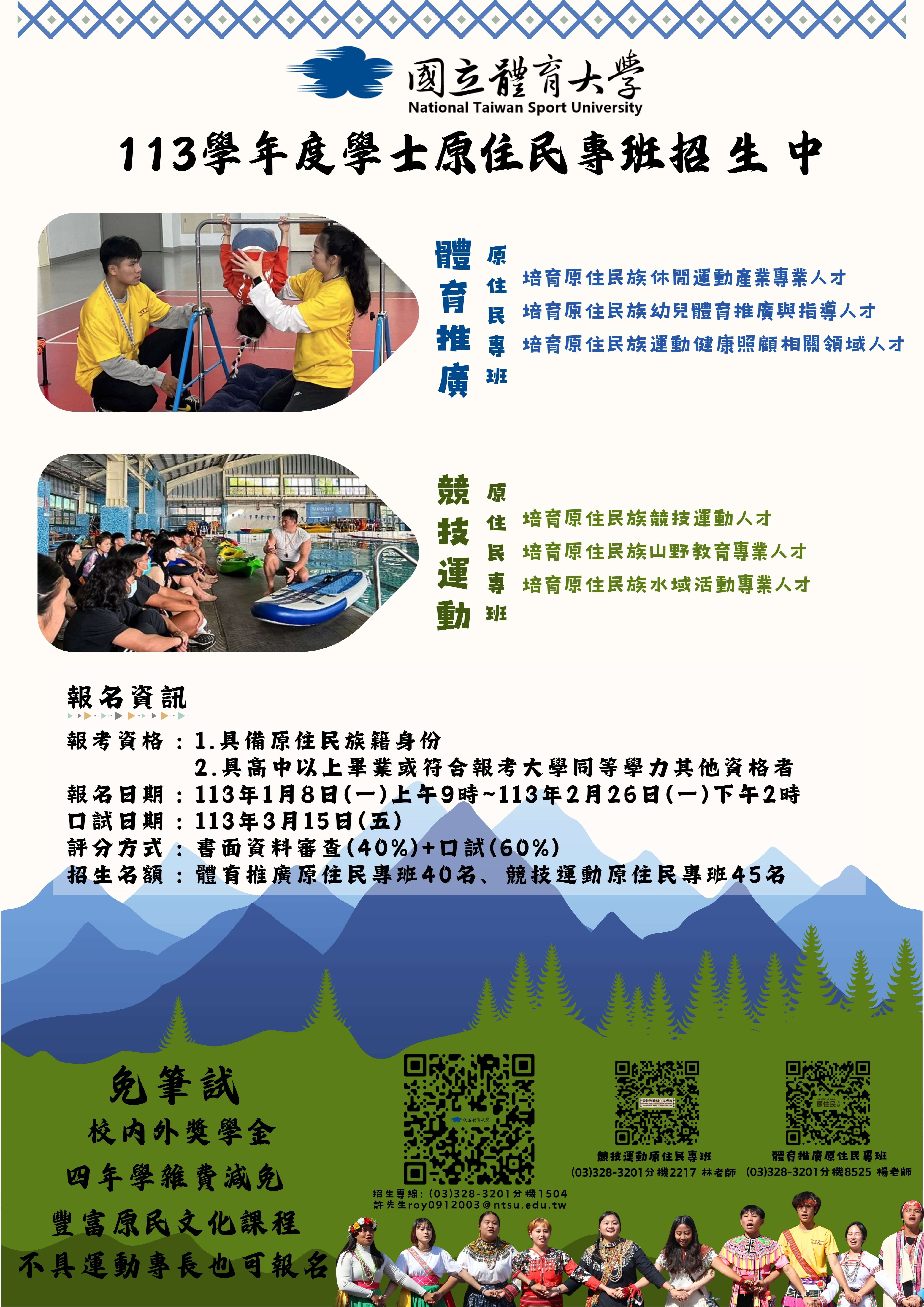 一、招生系所:體育學院體育推廣原住民專班、競技運動原住民專班。