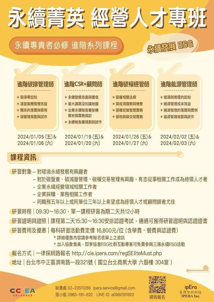 轉知社團法人中華三創菁英協會(CCIEA)主辦,臺北市學校教育產業工會協辦 【永續專責者必修】進階系列課程