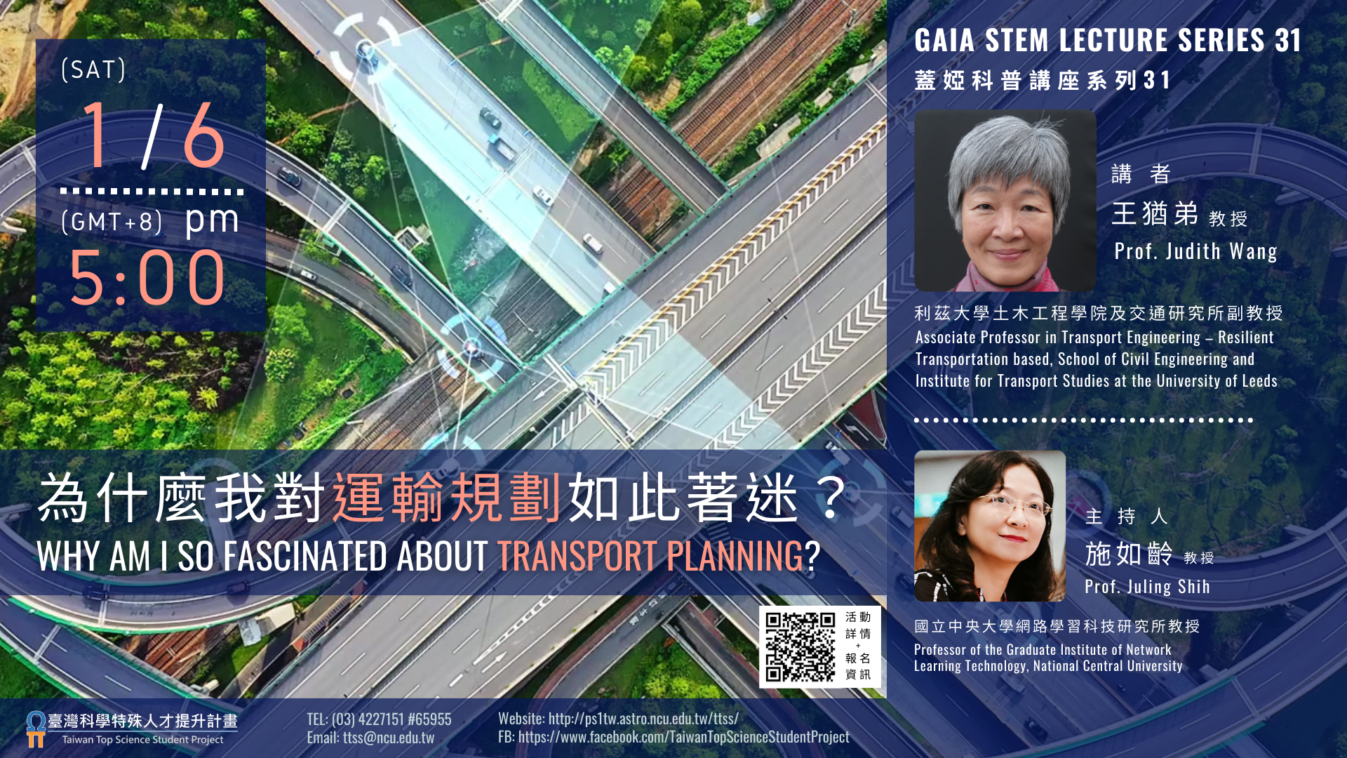 國立中央大學訂於113年1月6日辦理線上講座:《蓋婭科普講座系 列31》— 「為什麼我對運輸規劃如此著迷?」,請師生踴躍報名參加。(如附檔)
