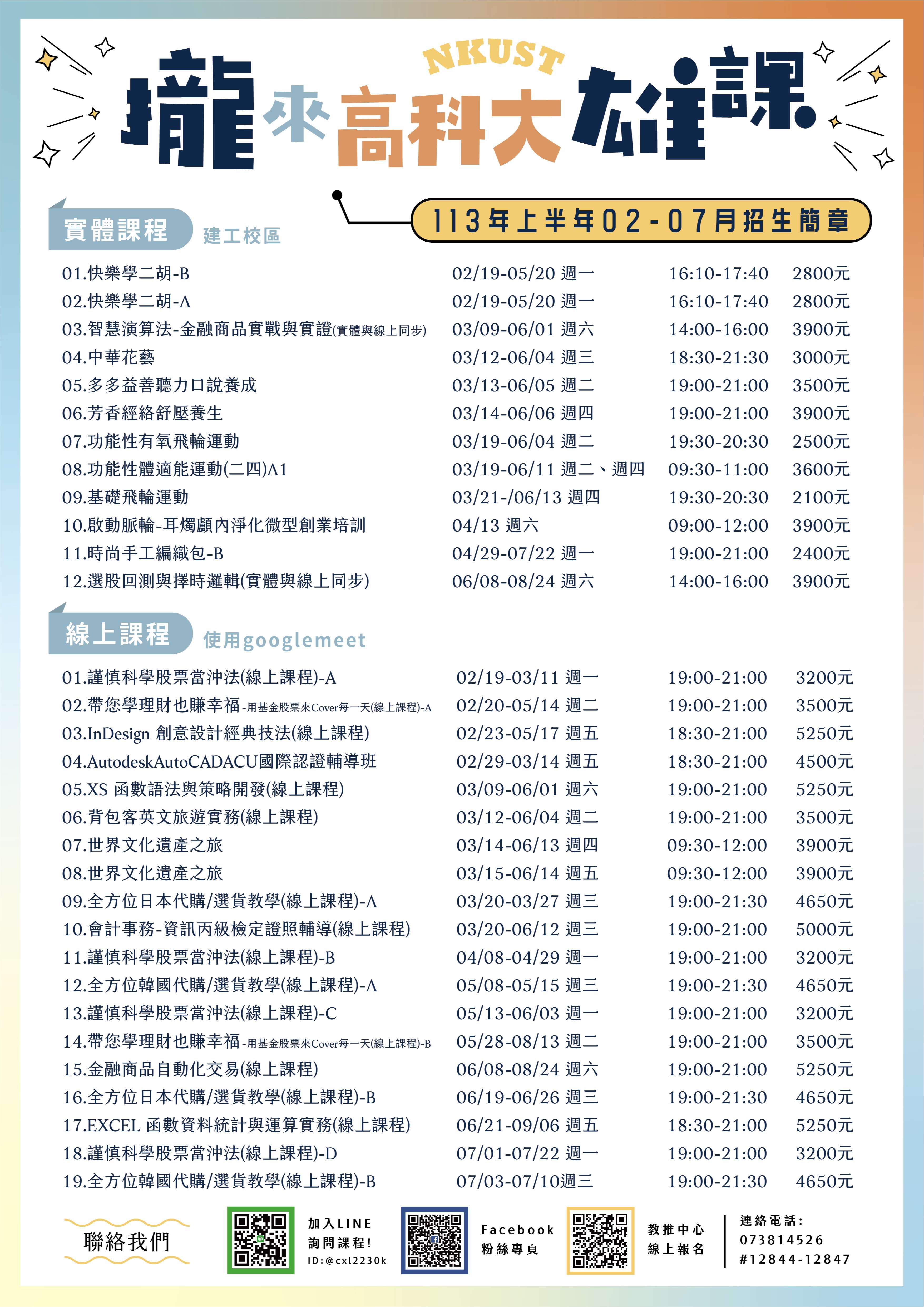 一、為便利學員學習無礙提高學習意願,本校特開設增進職能 相關實體及線上課程,歡迎對於理財規劃、藝術欣賞、軟 體應用、外語能力、運動紓壓有興趣的同仁報名參加。