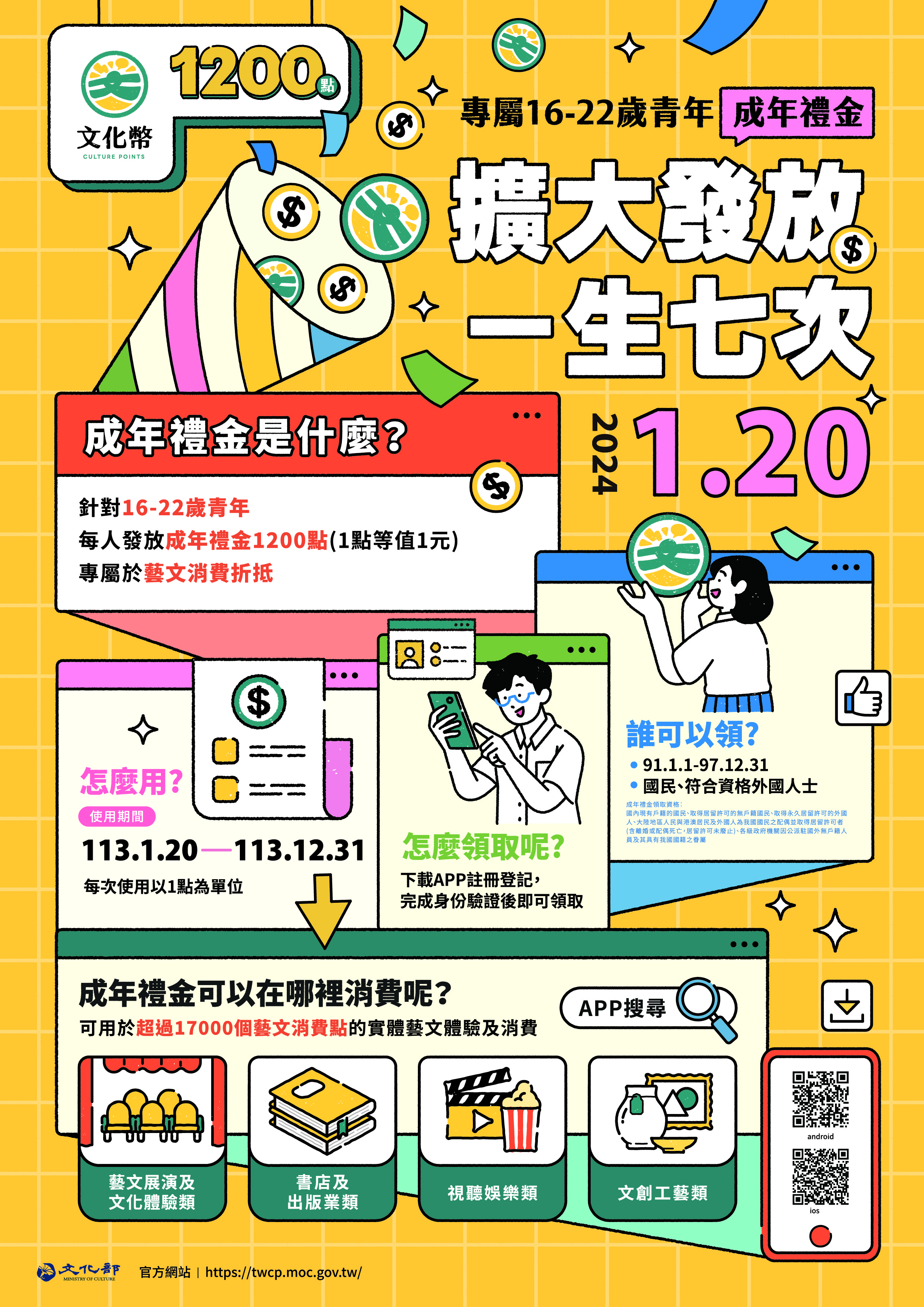 一、為提供青年藝文體驗機會,並擴大藝文消費人口支持藝文產業振興,文化部於113年擴大發放16至22歲符合資格青年,每人發放文化禮金1,200點文化幣(1點等值新臺幣1元),即日起開放領取使用。