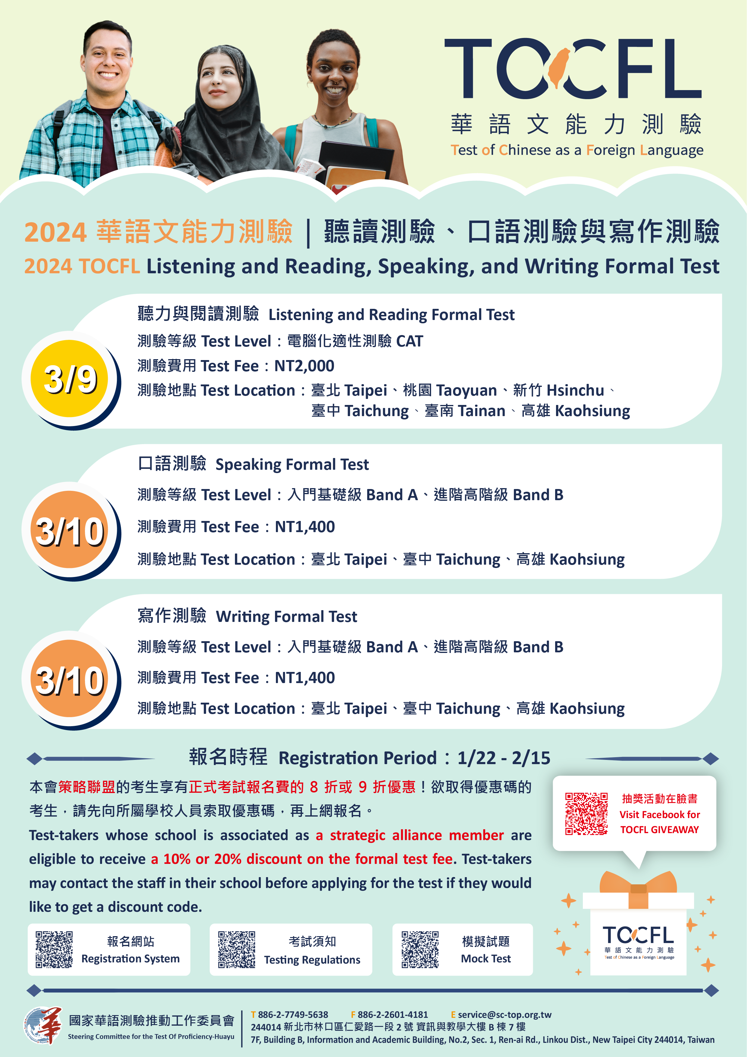五、抽獎活動:凡報考任一測驗並完成繳費者,可參加華測FB粉絲專頁抽獎活動。詳情請見粉絲專頁貼文:https://www.facebook.com/SCTOP.TOCFL。