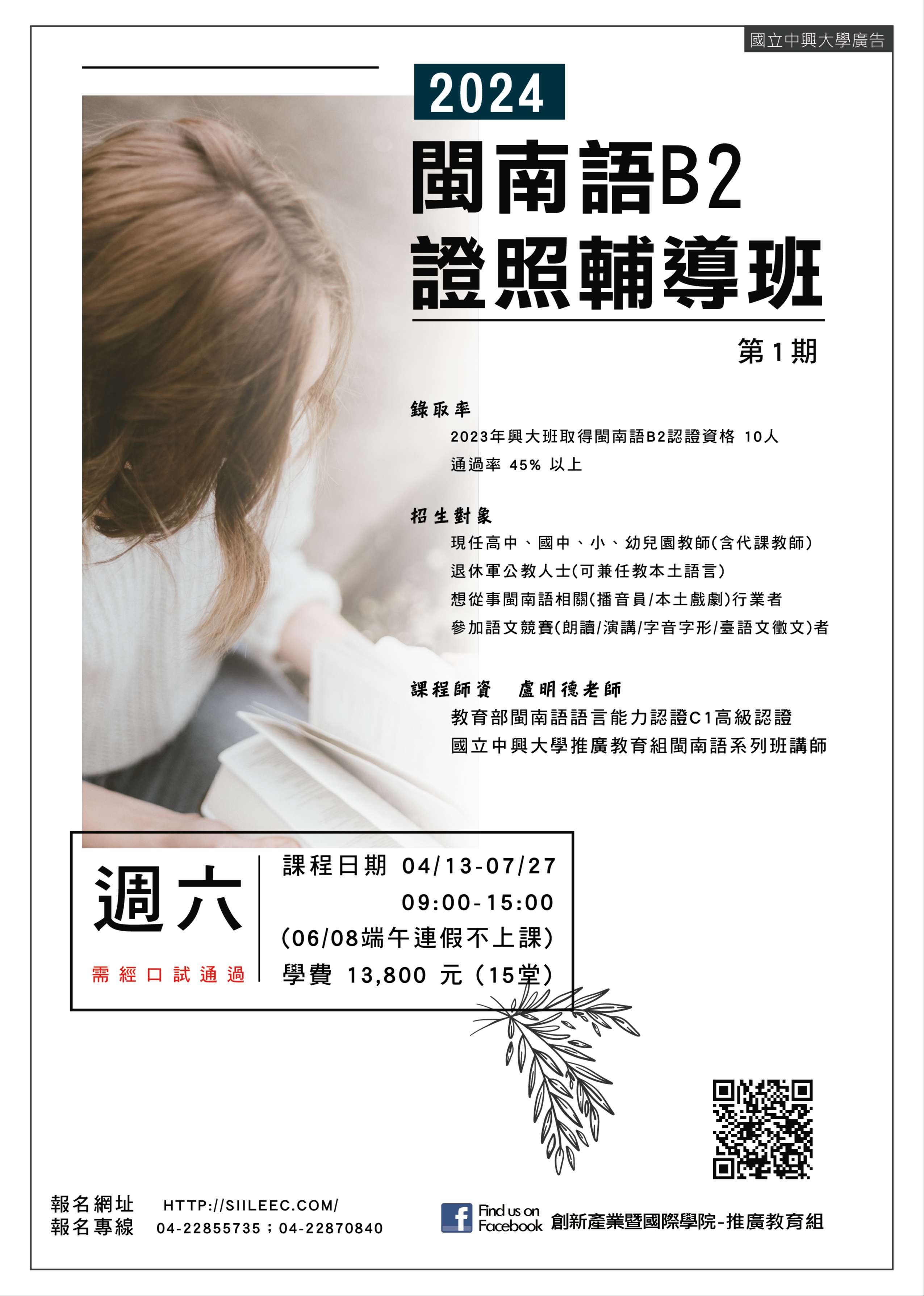 (一)閩南語B2證照輔導班第 1 期,2024/04/13-07/27,每週六9-15點(6/8端午連假不上課),共15次,優惠價13,800元(不含教材與午餐)。