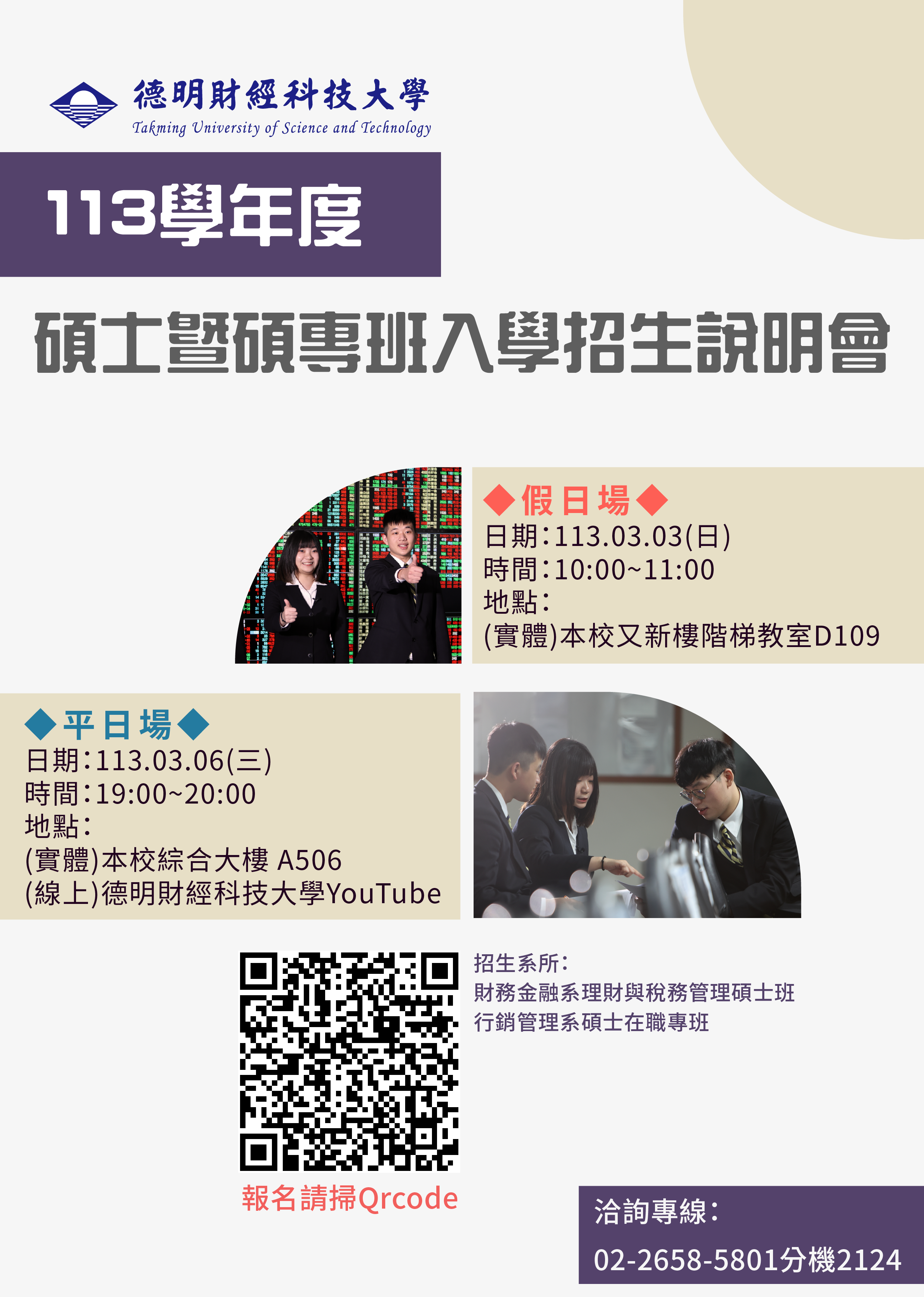 2、平日場:113/03/06(三)19:00-20:00 本校綜合大 樓 國際會議廳A506(實體+線上說明會 )