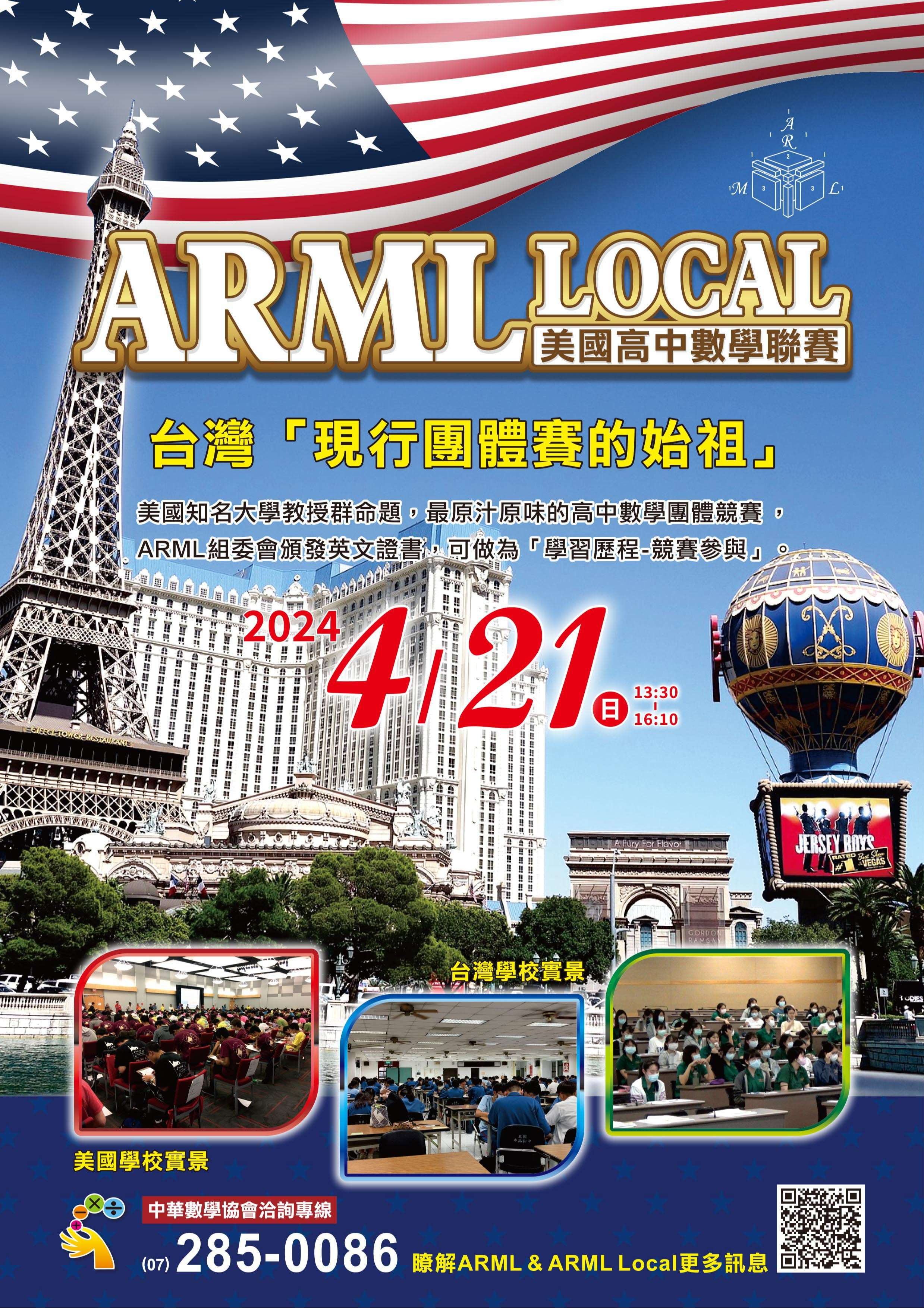「2024年美國高中數學聯賽(American Regions Mathematics League Local,簡稱ARML Local)」將於 2024年4月21日(日)舉行: