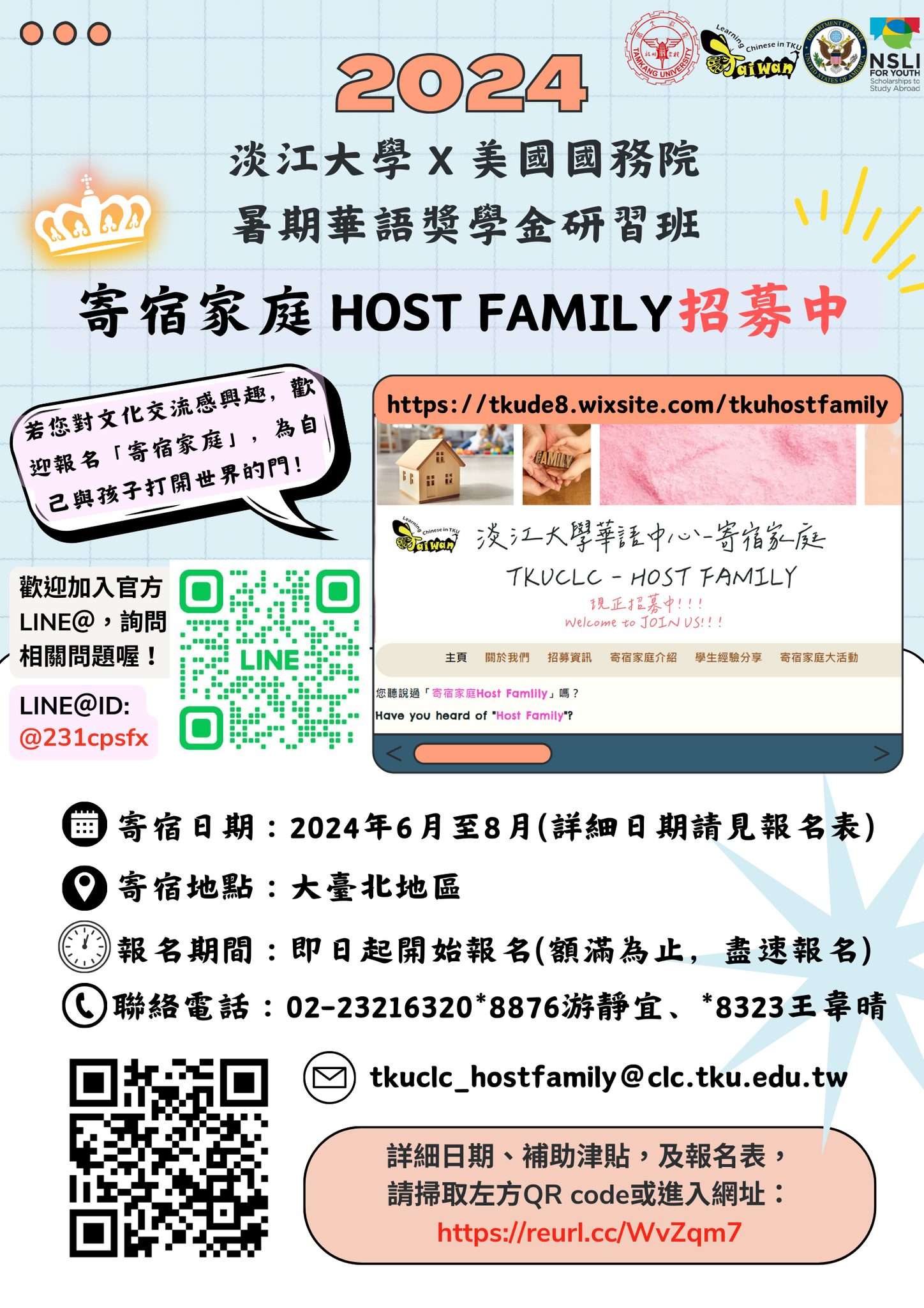 七、有意願提供寄宿空間之家庭需先行至報名網址完成報名, 承辦人員將審核家庭資料並安排實地走訪接待住宿地點, 再另行通知錄取及備取名單。 八、欲瞭解更多寄宿家庭詳細內容,請至該中心寄宿家庭官方 網站(網址:https://tkude8.wixsite.com /tkuhostfamily)查詢。 九、檢送寄宿家庭招募海報。 十、旨案聯絡人: (一)游靜宜Eunice;電話:(02)2321-6320轉8876;電子信 箱:euniceyu@clc.tku.edu.tw。 (二)王韋晴Ching;電話:(02)2321-6320轉8323;電子信 箱:weiching@clc.tku.edu.tw。
