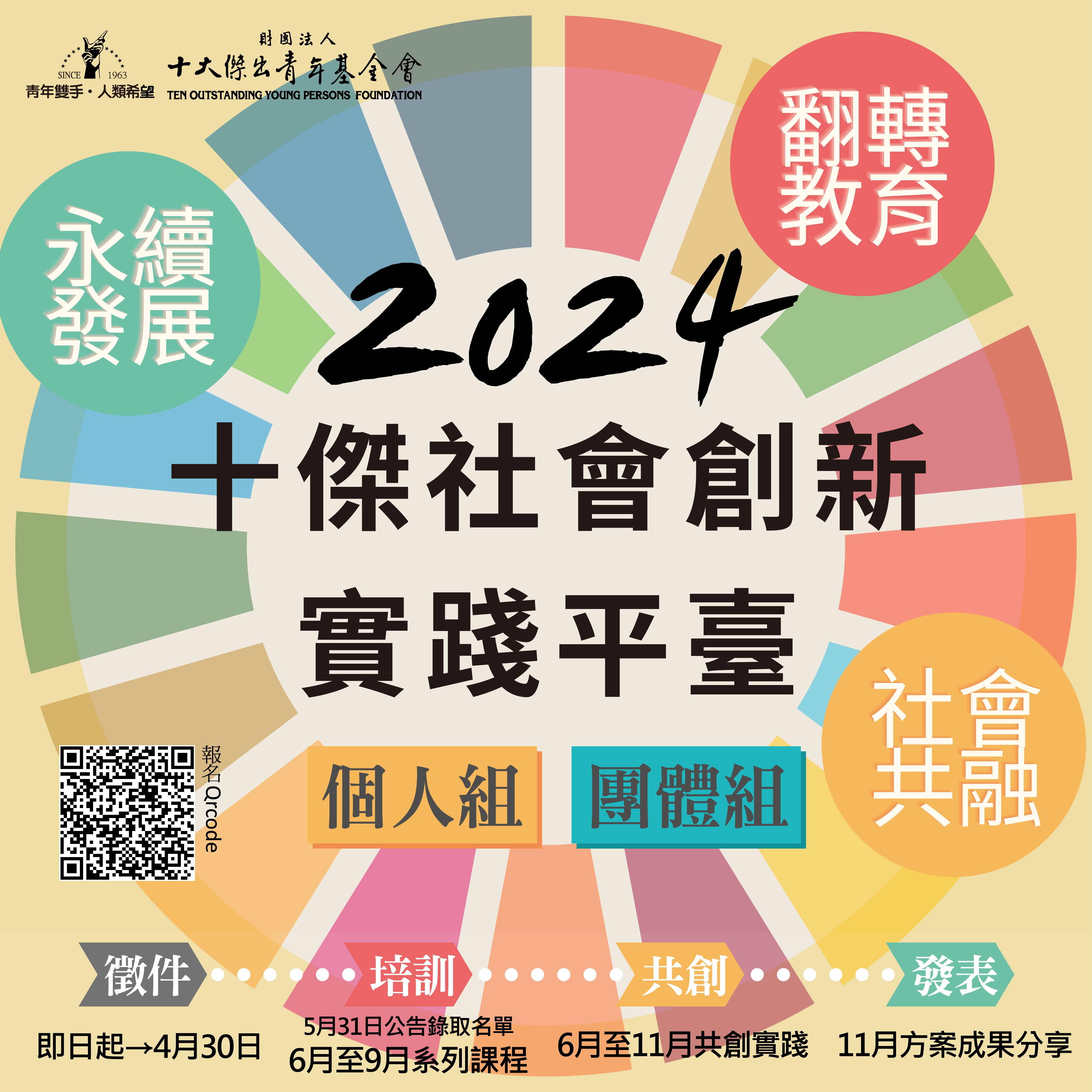 二、2024年「十傑社會創新實踐平臺計畫」以「永續發展」、「翻轉教育」、「社會共融」三大面向作為本年度徵件主題,鼓勵青年提出具創新、影響力的社會實踐方案並以具體行動回應並嘗試解決各種社會問題。