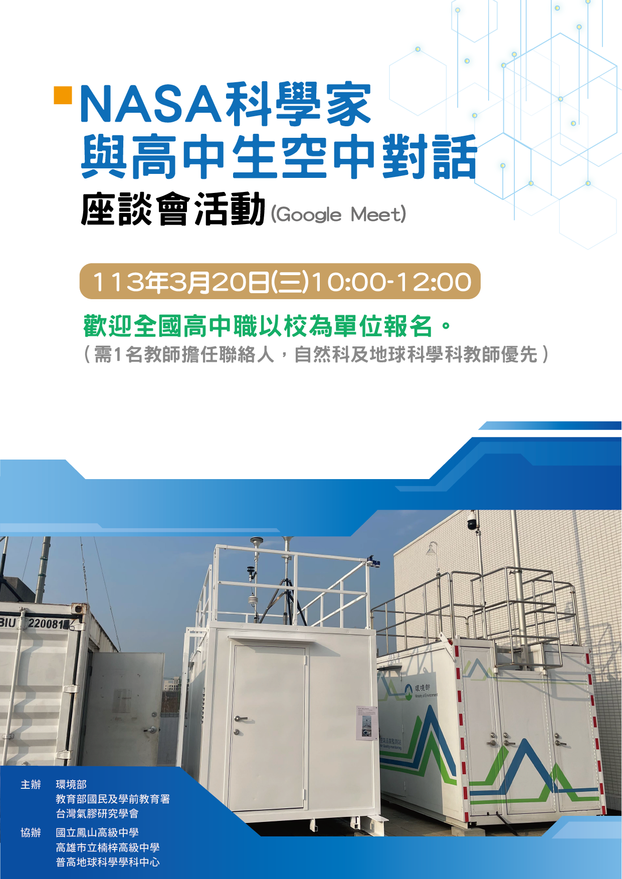 一、本活動由環境部、教育部國教署、台灣氣膠研究學會主辦、鳳山高中、楠梓高中及地球科學學科中心協辦。