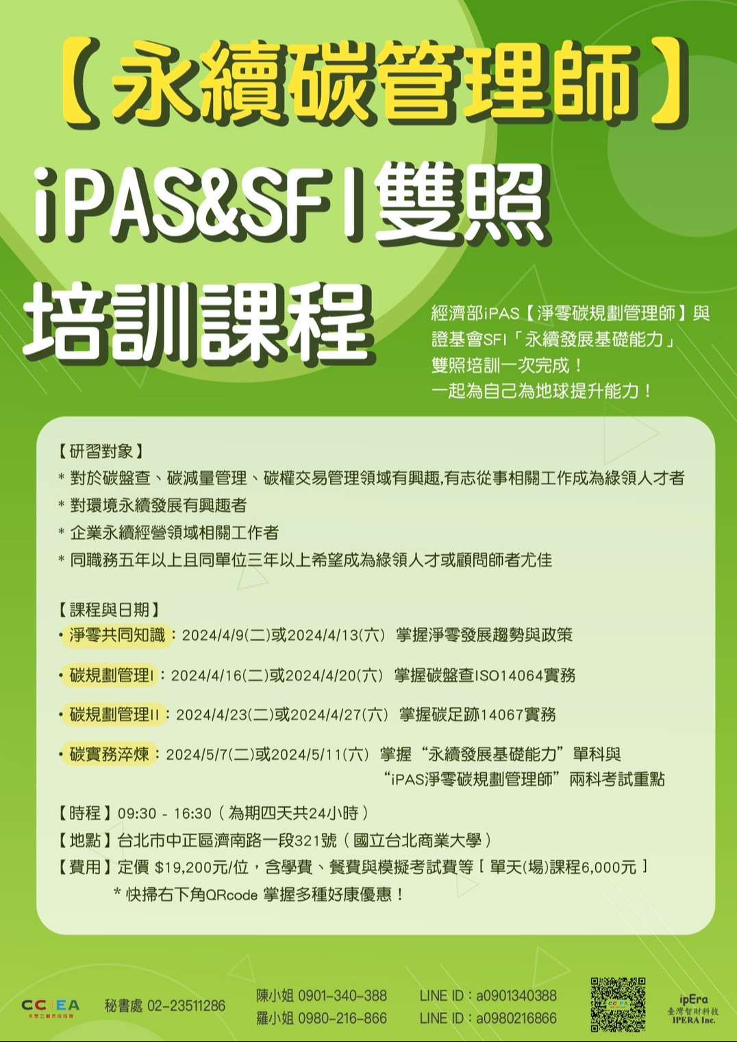敬邀大臺北地區(包含基隆市、臺北市、新北市、桃園市等)大專及高中職教師參加【113年雙照培訓 永續碳管理師】 -【經濟部iPAS「淨零碳規劃管理師」與證基會SFI「永續發展基礎能力」】培訓課程,自113年4月9日至5月11日(平日班或假日班4個週二或週六09:30~16:30,為期四天共24小時),辦理地點: 臺北市中正區濟南路一段321號(國立臺北商業大學,上課教室將於課前通知) 。詳細課程說明及收費,請連結下列表單進行報名手續: http://cie.ipera.com/regiPAS2NZ.php。