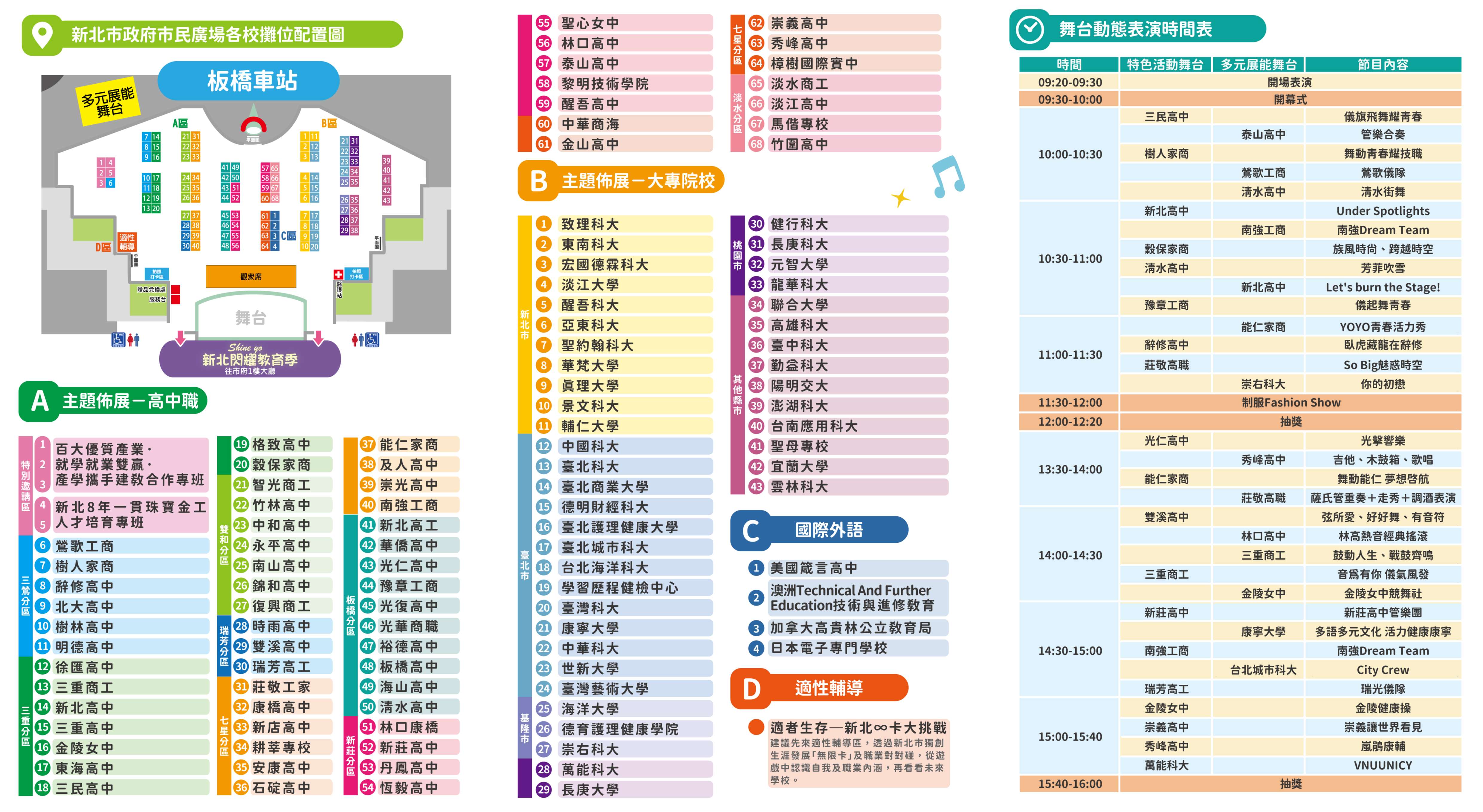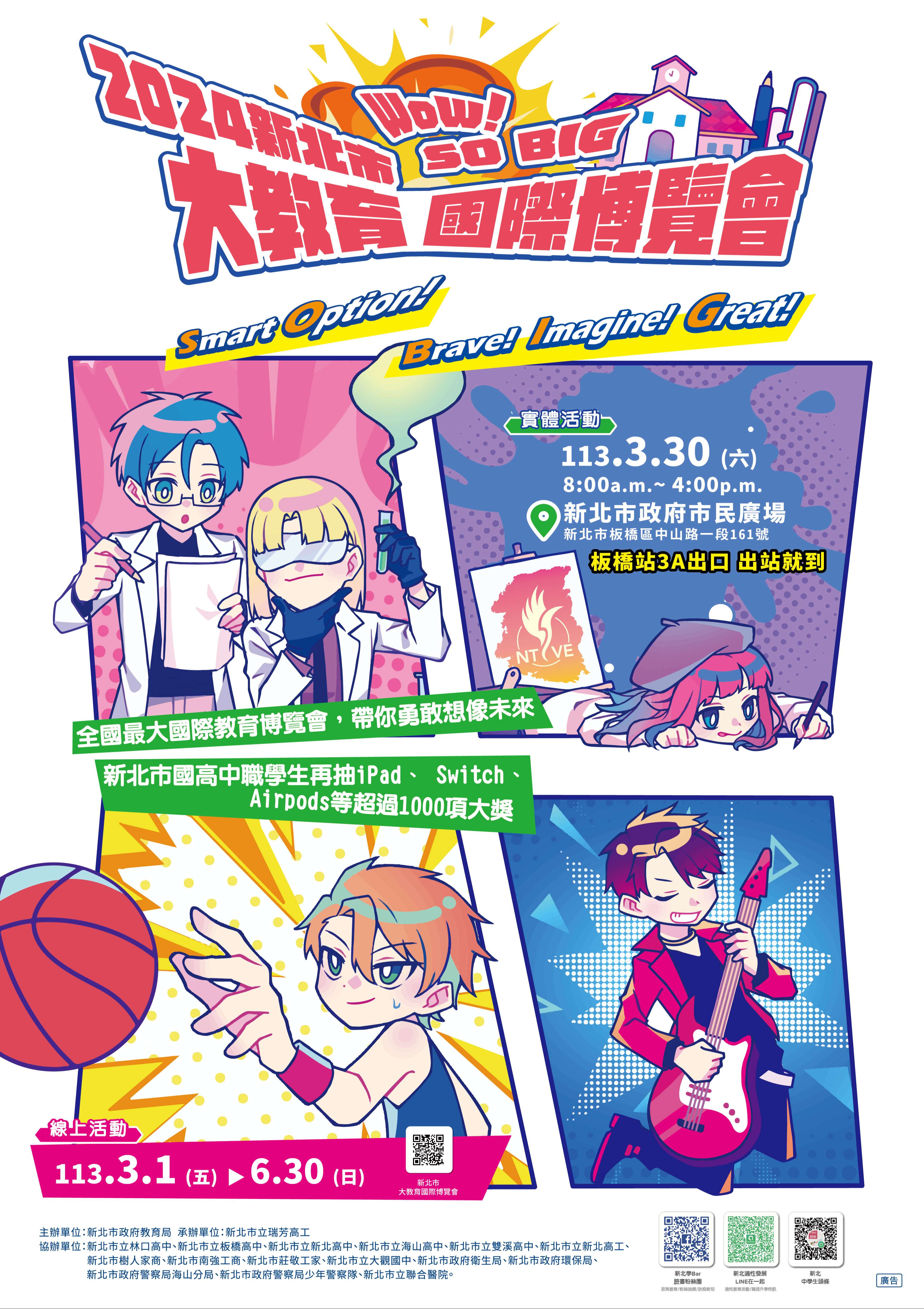 二、新北市政府教育局訂於113年3月30日(星期六)上午8時至下午4時於新北市政府市民廣場(新北市板橋區中山路一段161號,板橋車站3A出口),本次活動首次邀請46所大專院校及60所新北市優質高中職學校參與,共有超過100所學校特色體驗課程,並設有國際外語及適性輔導專區、超過30個精采的表演節目,歡迎北北基桃國高中學生及家長來現場參加,瞭解大專院校及新北市優質高中職學校特色。