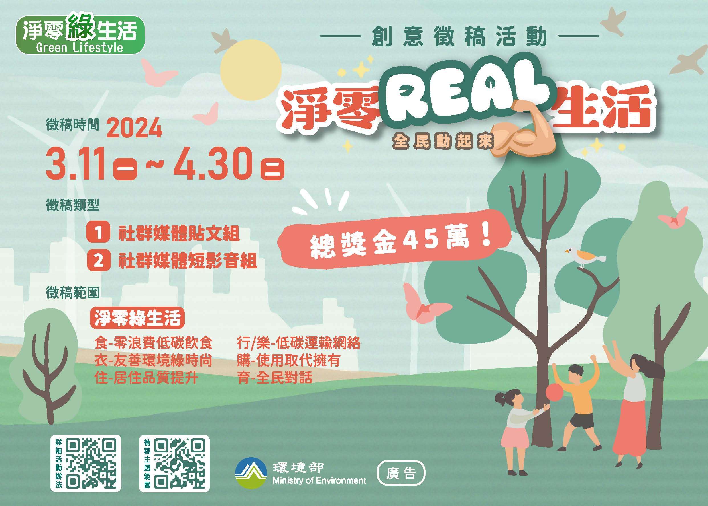 一、為鼓勵社會大眾了解淨零綠生活概念及激發創作靈感,環 境部特辦理貼文及主題曲短影音徵稿活動,鼓勵各界報名 參加。