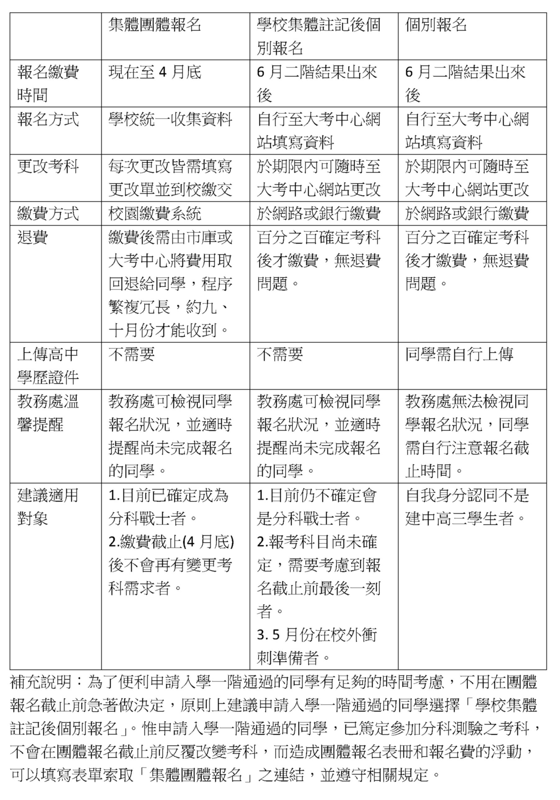 三、此為集體報名方式中更便利的選擇,考區及試場亦將與本校全部高三同學一同分配,且無需到校領取並繳交報考資料確認表。