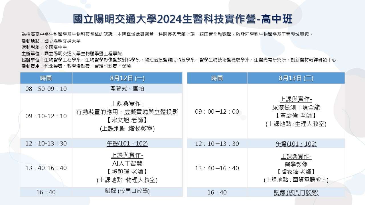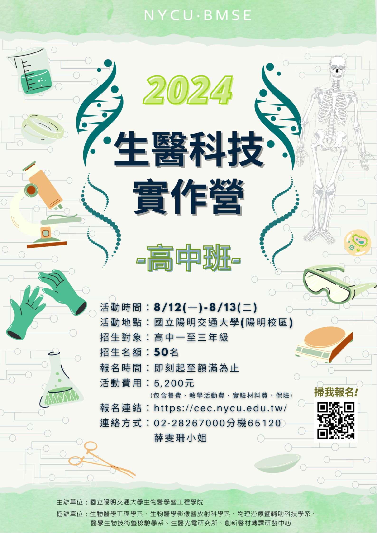 三、「2024生醫科技實作營」暑假梯次招生海報及課程規劃,請自行參閱附件。