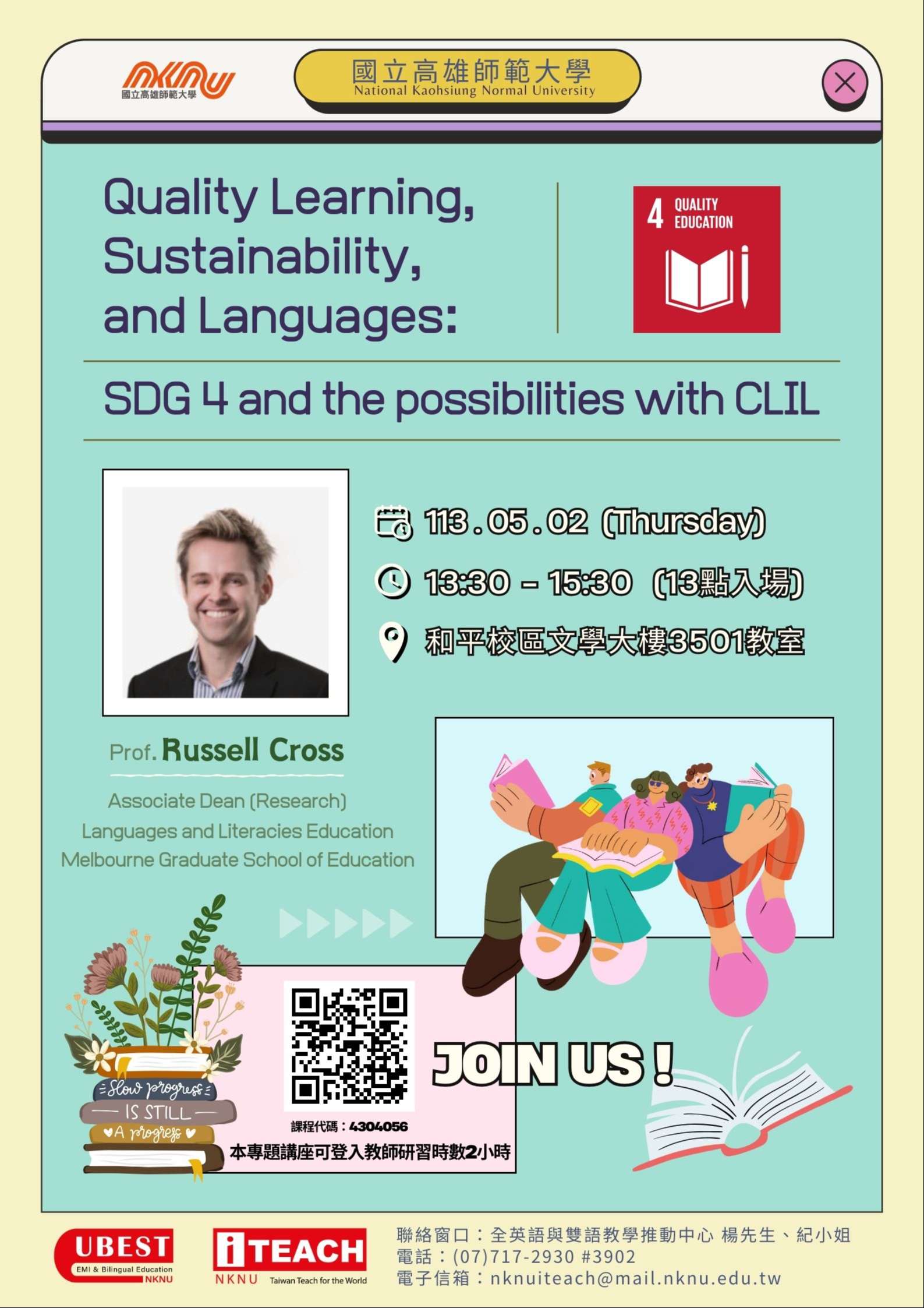一、配合國家雙語政策,提升雙語教學授課新知,本校特邀澳 洲墨爾本大學Dr.Russell Cross, Associate Dean (Research), Languages and Literacies Education, Melbourne Graduate School of Education講授CLIL教學 技巧。