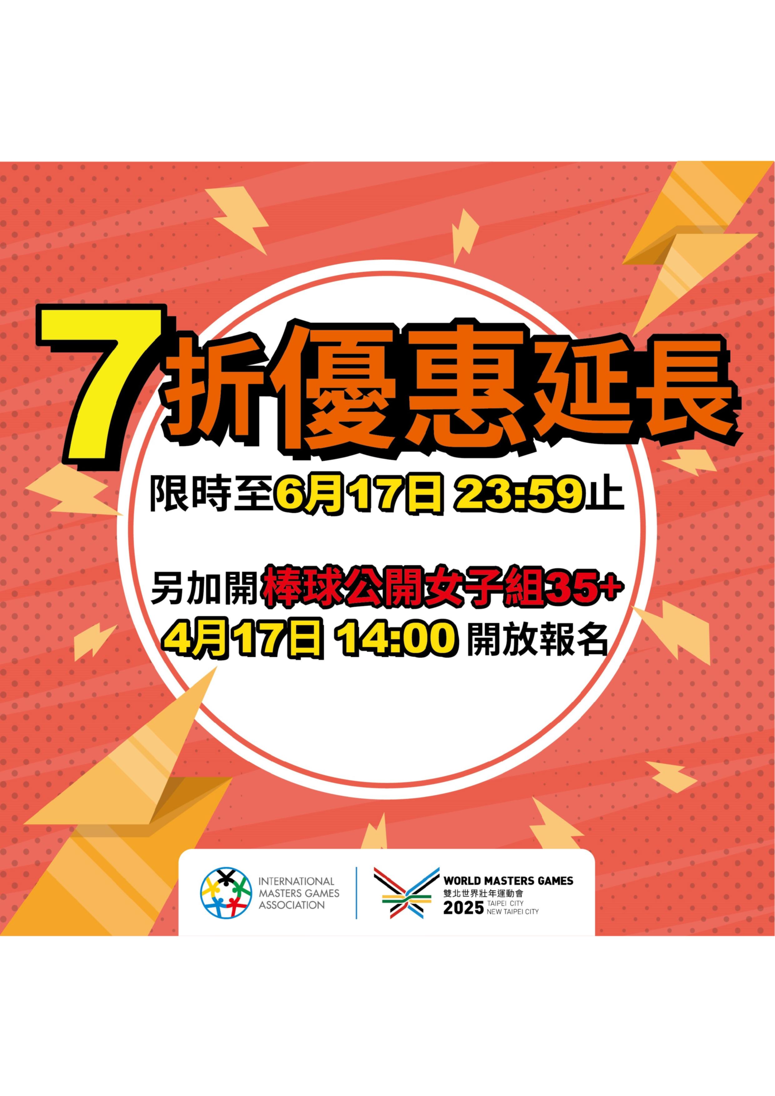 三、為鼓勵更多運動愛好者參與,再加上本次賽會創歷屆世界壯年運動會先例,近期首度增納女子棒球,且考量賽事能見度持續提升、國內外關注民眾不斷增加,故原訂113年4月17日截止的早鳥報名優惠,特再延長至6月17日,凡此期間報名者均可享7折優惠(如附件),如有報名意願者,可逕至官網(https://wmg2025.tw/zh-tw/home/zh-tw)報名參加。