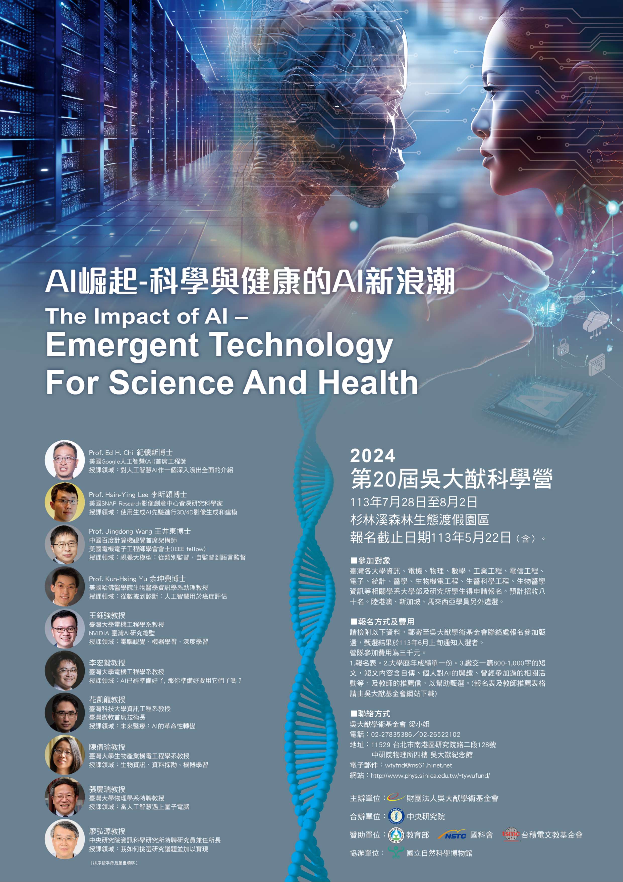 依照往例,邀請高中老師參加科學營(今年包括國內及馬來西亞的高中老師),歡迎 貴校推薦對AI議題有興趣及專長之教師,回校後能熱情推動相關概念的資訊、物理、生物或數學背景教師參加,與其他大學生及國內外學者專家共聚一起互相學習與交流。報名截止日期為5月28日。隨函檢附推薦表格、報名表、及招生海報電子檔 (招生海報內容為針對大學生和研究生,僅供參考)。科學營網址:https://www.phys.sinica.edu.tw/~tywufund/camps.html