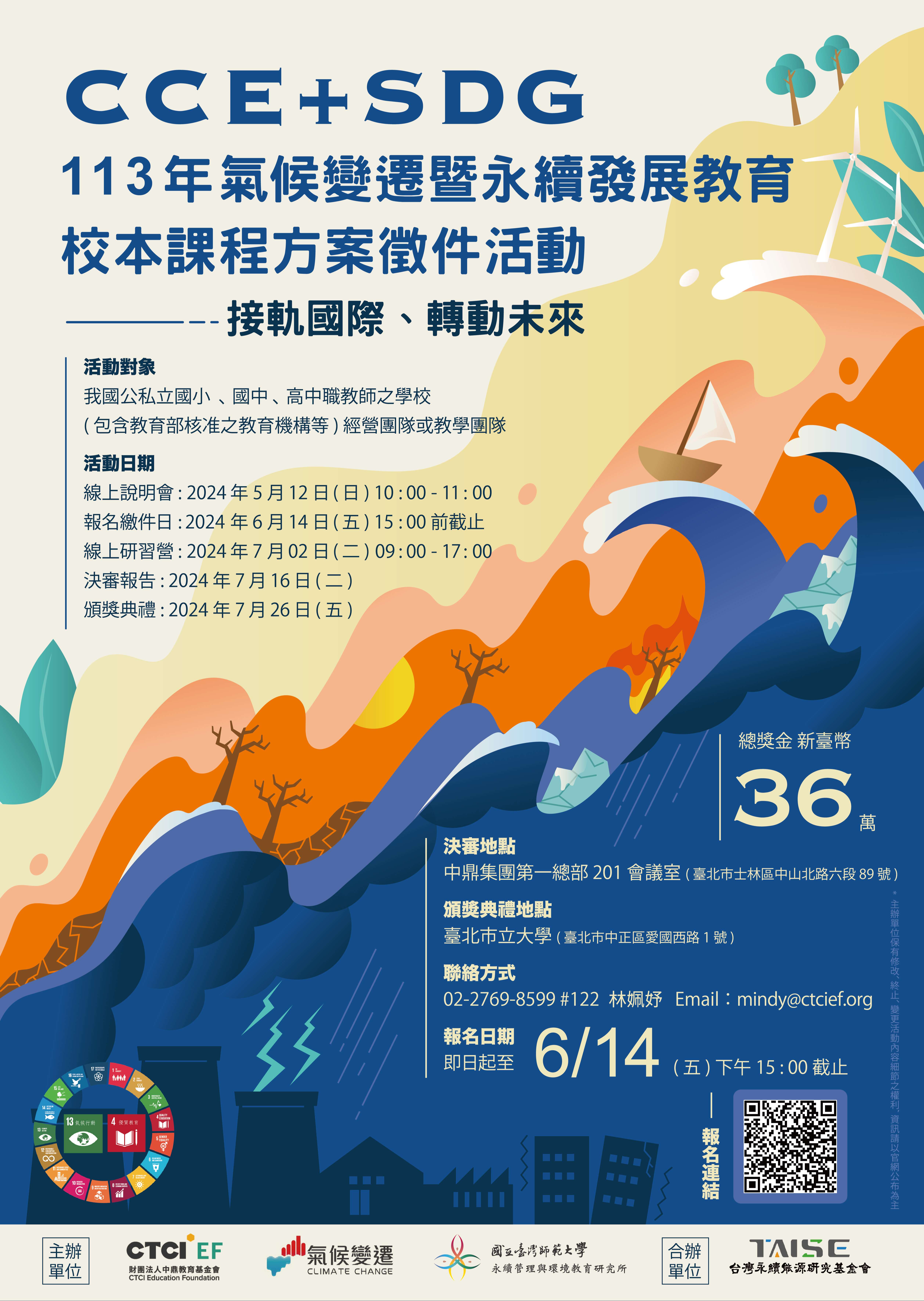 一、為強化我國教育人員對於氣候變遷教育(CCE)、永續發展教 育(ESD)與聯合國永續發展目標(SDGs)之認識,朝向「氣候 變遷暨永續發展教育」(CCESD=CCE+ESD)國際趨勢邁進,連 結永續發展目標(SDGs)後,成為CCESDG,於各級學校推動 『以永續發展為導向之氣候變遷教育』。中鼎教育基金會 (CTCIEF)特與教育部氣候變遷教學資訊平臺氣候變遷教育 推動計畫、國立臺灣師範大學永續管理與環境教育研究所 及台灣永續能源硏究基金會(TAISE)共同籌辦旨揭徵件活 動,以鼓勵教師研發與編製「氣候變遷暨永續發展教 案」。