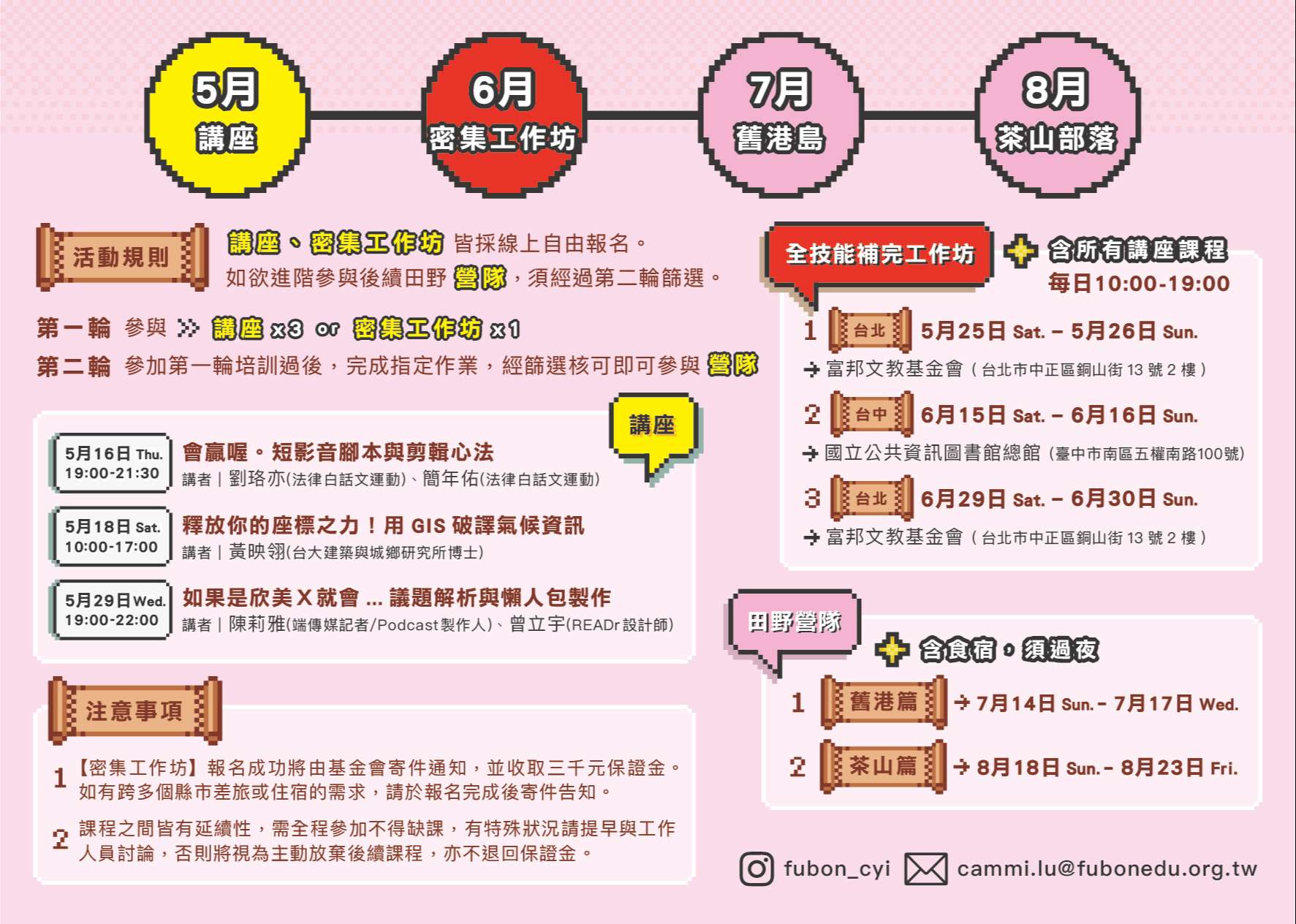 二、本次系列的講座、工作坊和田野營隊,包含了氣候溝通的 理論及實作。學員將(1)學習從GIS圖資套疊的技術認識台 灣的山川地貌、雨量、氣溫等如何與之交互影響;(2)學習 拍攝剪輯一支短影片,以傳遞訊息給更多人;(3)學習問出 一個有深刻意義、有溫度並與氣候變遷有關的提問,藉由 深刻的田野調查,發掘土地與人的連結,讓台灣的大自然 去回應你的問題;將這些學習製作成可以再次傳播出去的 可視化圖片、短影片,讓更多人一起關心台灣這塊土地。