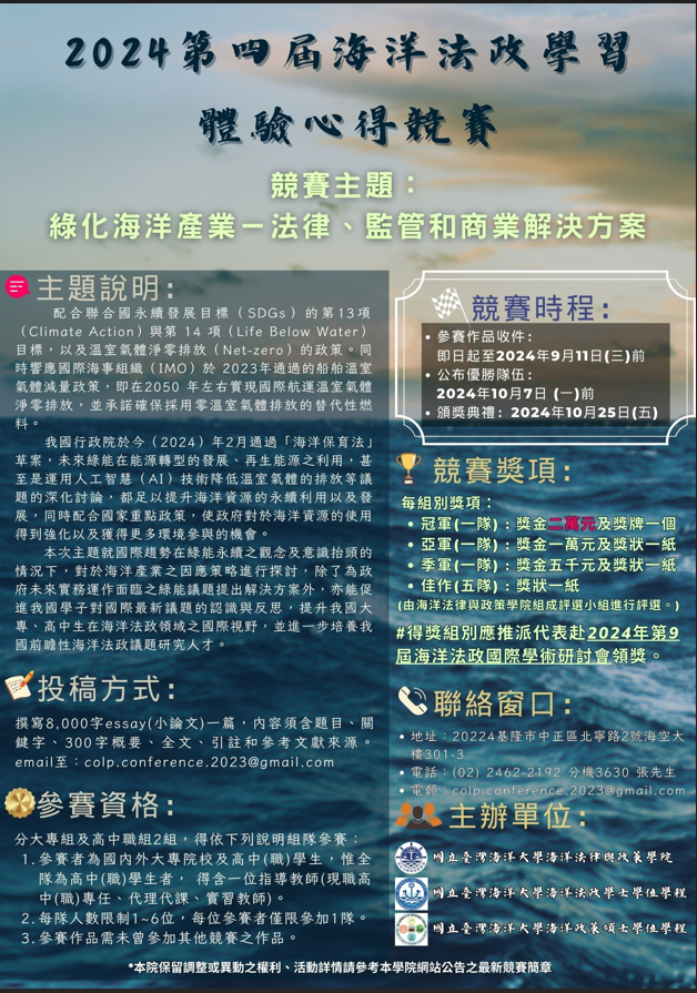 轉知國立臺灣海洋大學「2024第四屆海洋法政學習體驗心得競賽」資訊: