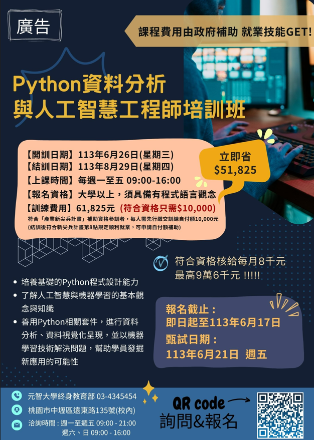 相關課程資訊請以google搜尋「元智大學Python資料分析 與人工智慧工程師培訓班」或洽該校終身教育部,電話:(03)4638800轉分機2490或2492。