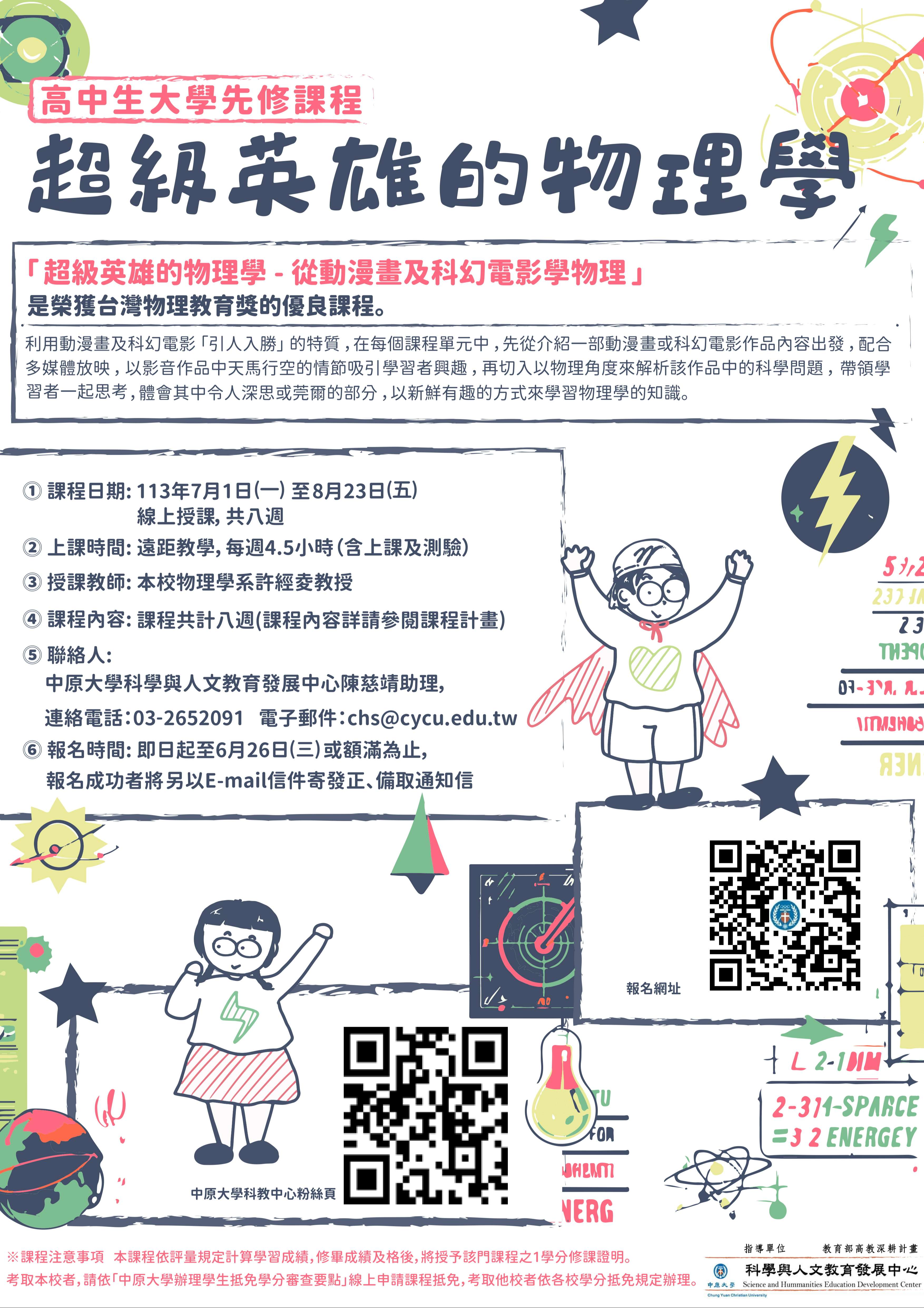 中原大學113年7月1日至8月23日辦理高中生大學先修課程 「超級英雄的物理學」: