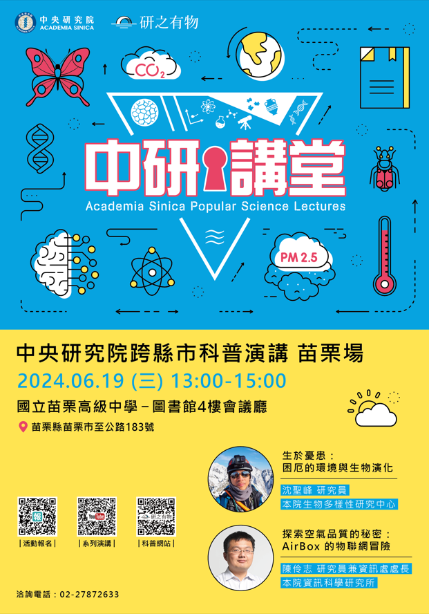 轉知中央研究院於6月19日(星期三)舉辦「中研講堂」苗栗場科普演講: