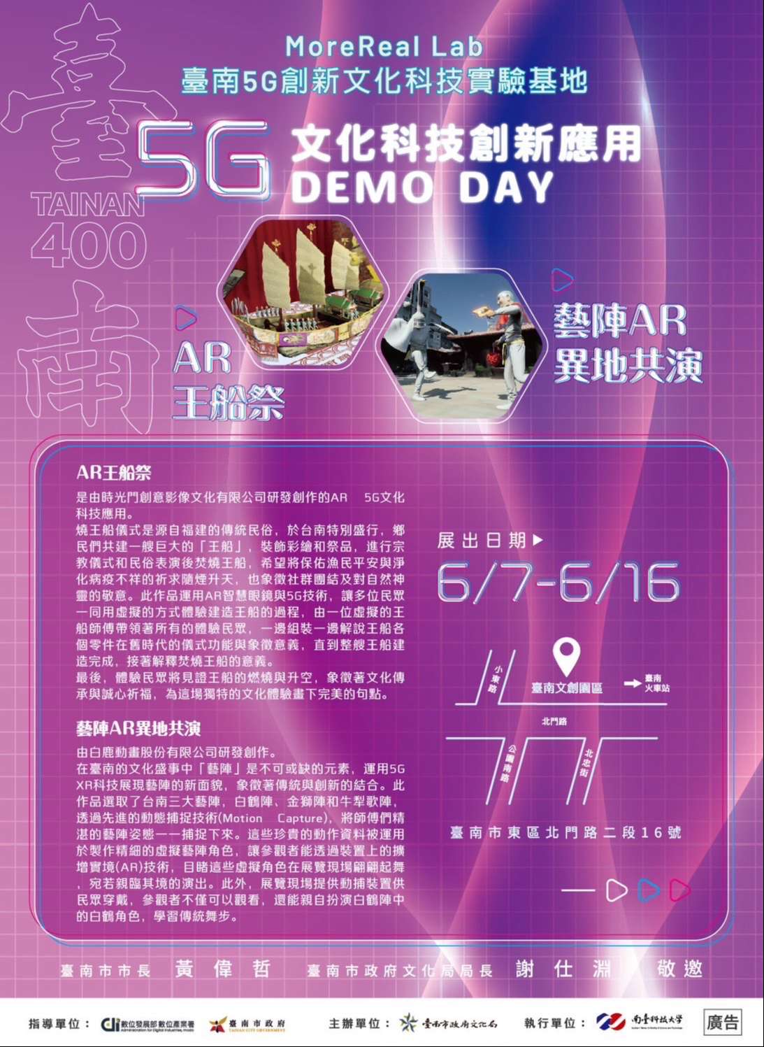 一、體驗活動由臺南市政府文化局與本校攜手推動文化產業數位轉型,致力於運用5G科技翻轉臺南古城,於 MoreReal Lab 臺南5G創新文化科技實驗基地辦理第二場 Demo展,主題聚焦於傳統文化與5G科技的結合,展示新創團隊「藝陣AR異地共演」及「AR王船祭」等創新作品,歡迎各界踴躍參與體驗。