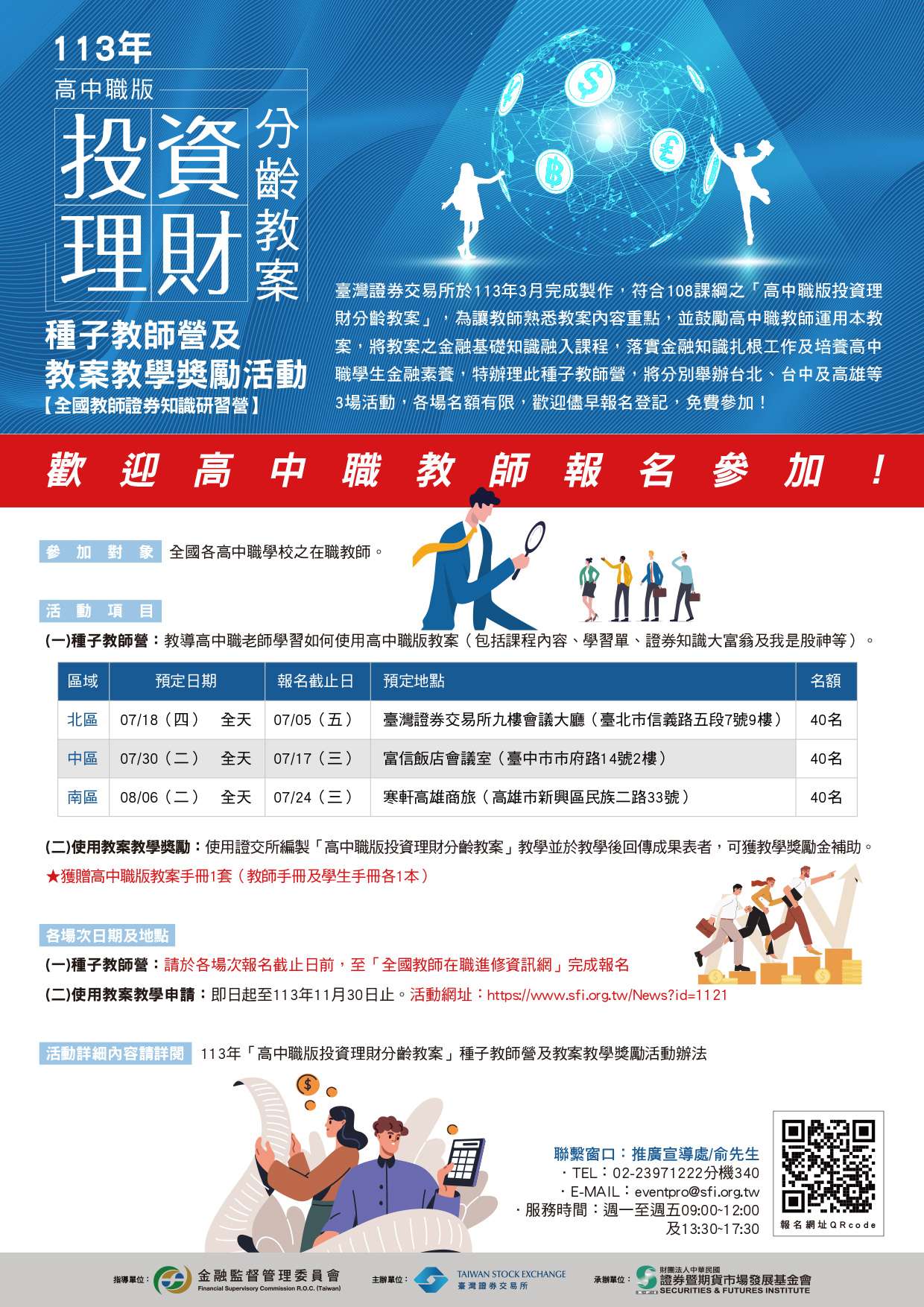 三、種子教師營活動自113年7月18日起至8月6日止,分別於臺北市、臺中市及高雄市共舉辦3場次,免費提供全國各高中 職學校之在職教師參加研習,參與教師並可獲得「教師研 習時數」認證。