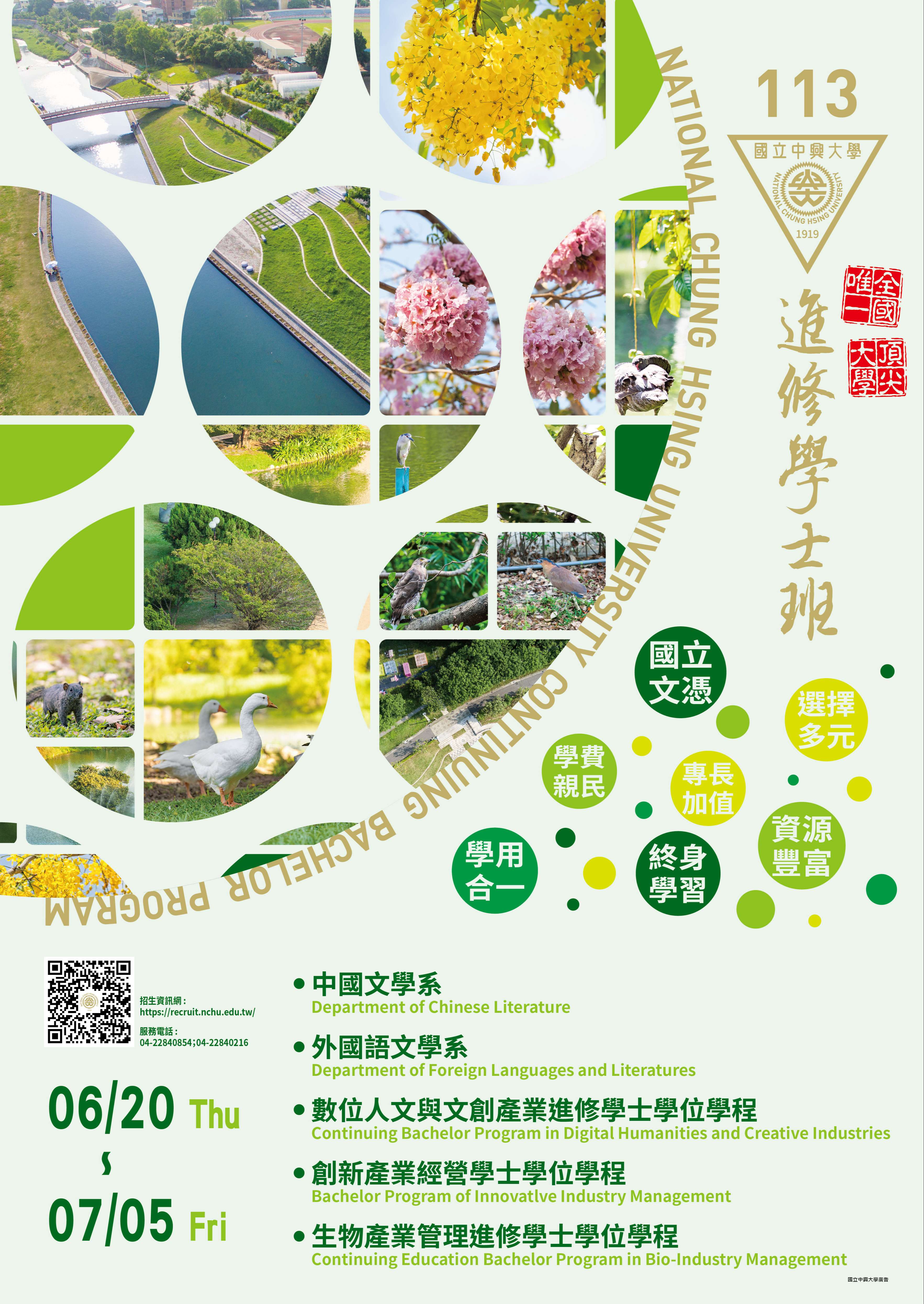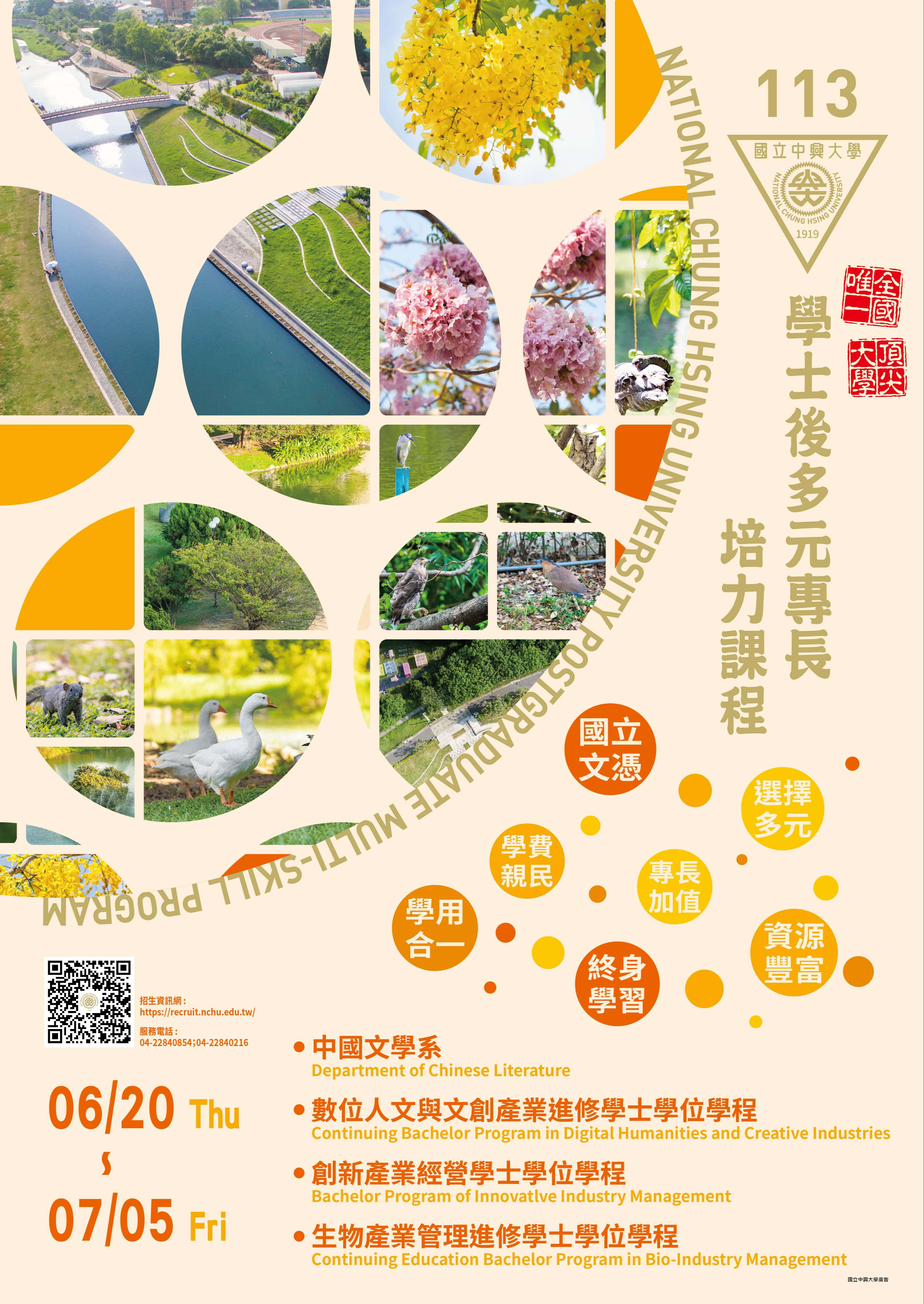一、國立中興大學113學年度進修學士班、學士後多元專長培力課程招生學系(學士學位學程)及名額如下: