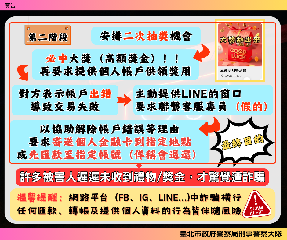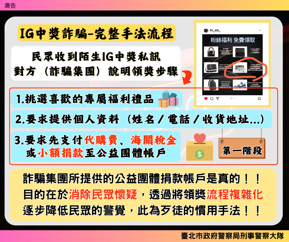 二、為賡續落實本市分齡分眾識詐宣導教育,本月以AI換臉詐騙、新型態IG中獎詐騙為宣導主軸,彙整反詐影片1部、圖片4張,均儲存於Google雲端連結(如附件)。