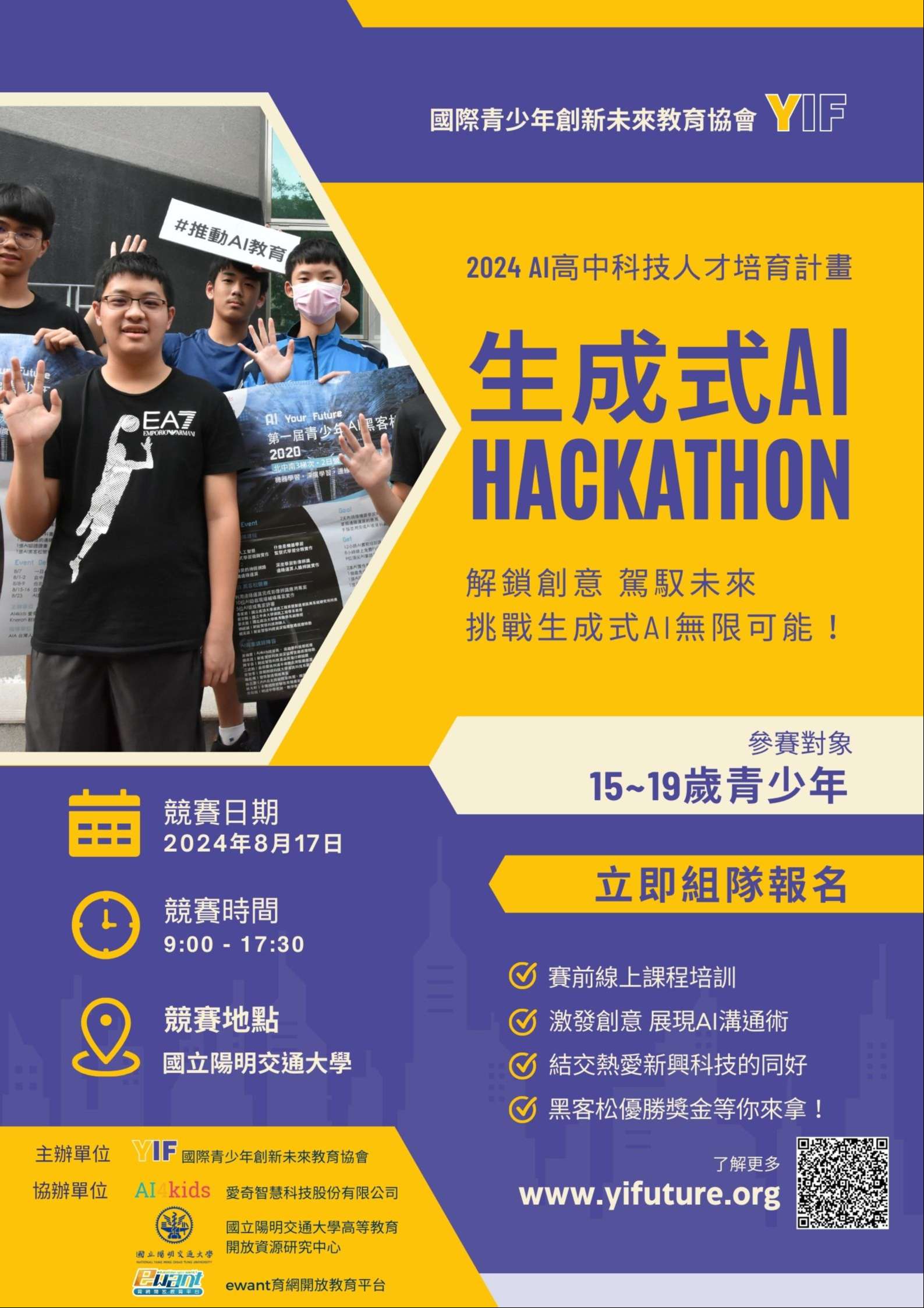 一、競賽目標:為了促進中學生對生成式 AI 原理的深入理解與跨領域應用能力,國際青少年創新未來教育協會將聯合 AI4kids、國立陽明交通大學高等教育開放資源研究中心以 及 ewant 育網開放教育平台,在暑假期間舉辦生成式 AI 黑客松競賽。本次活動旨在提升青少年的科技素養,激發未來學習和生活中創新應用生成式 AI 的潛能。