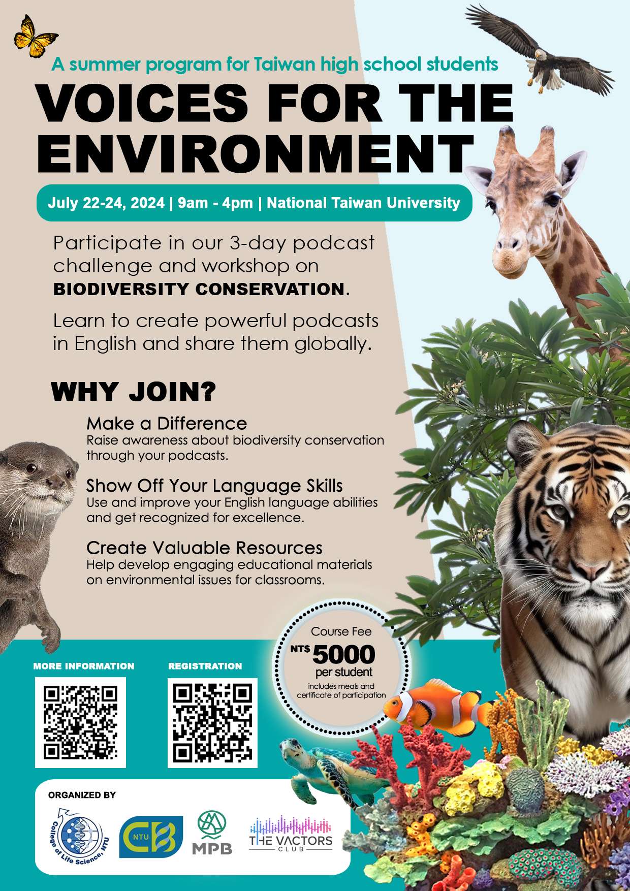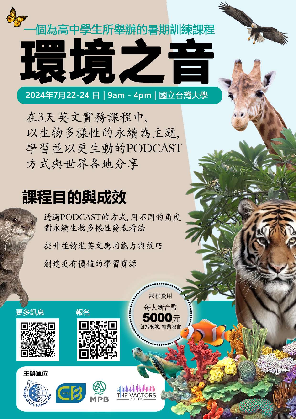 一、本校生物技術研究中心與新加坡團隊The Vactors Club辦 理「2024環境之音Podcast創作課程與競賽」,時間為113 年7月22日至24日,活動地點於本校生命科學館。