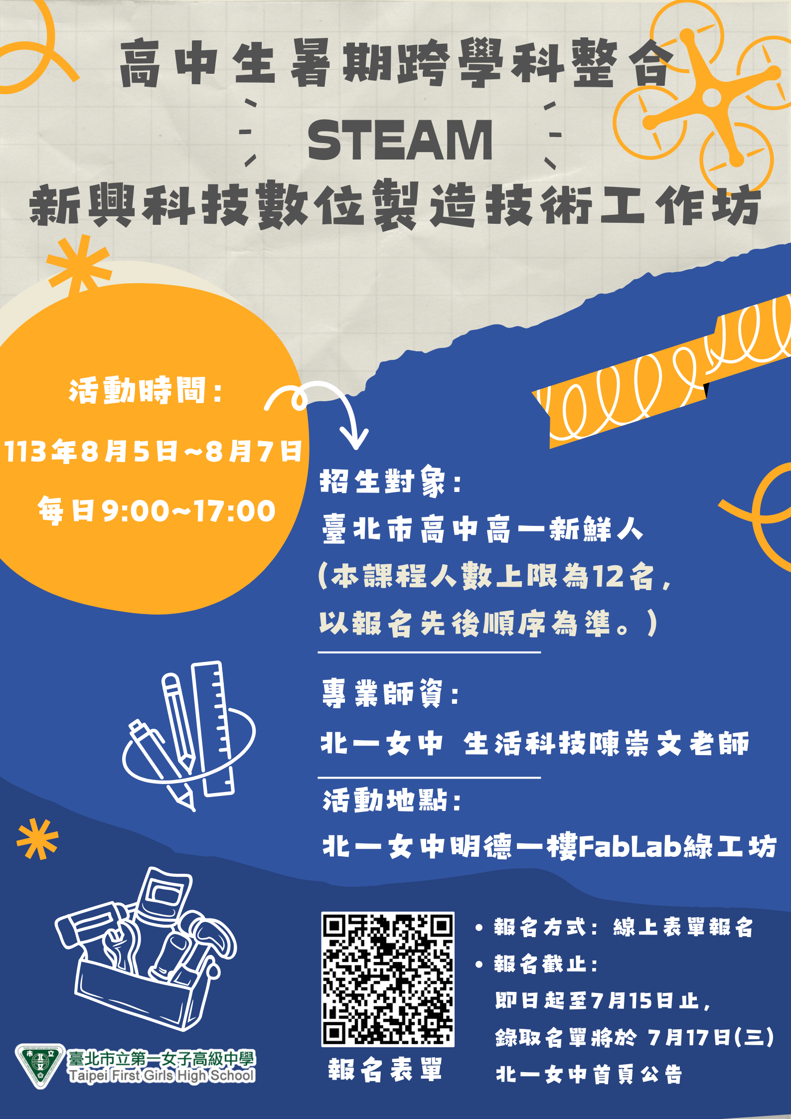 轉知臺北市立第一女子高級中學113年度新興科技教育遠距示範服務計畫舉辦「高中生暑期跨學科整合(STEAM)新興科技數位製造技術工作坊」:
