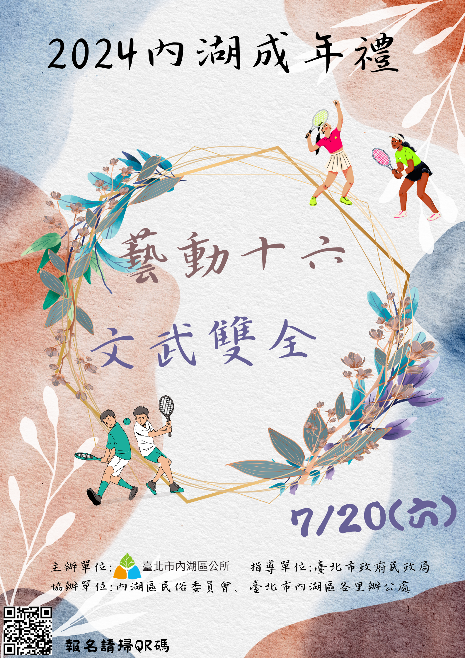 內湖區公所113年7月20日 成年禮活動,內容包含新住民表演、手作體驗、成年禮儀 式及任天堂Switch互動遊戲,歡迎設籍或就讀於臺北市之 青年男女(民國95、96、97年次)踴躍報名參加。