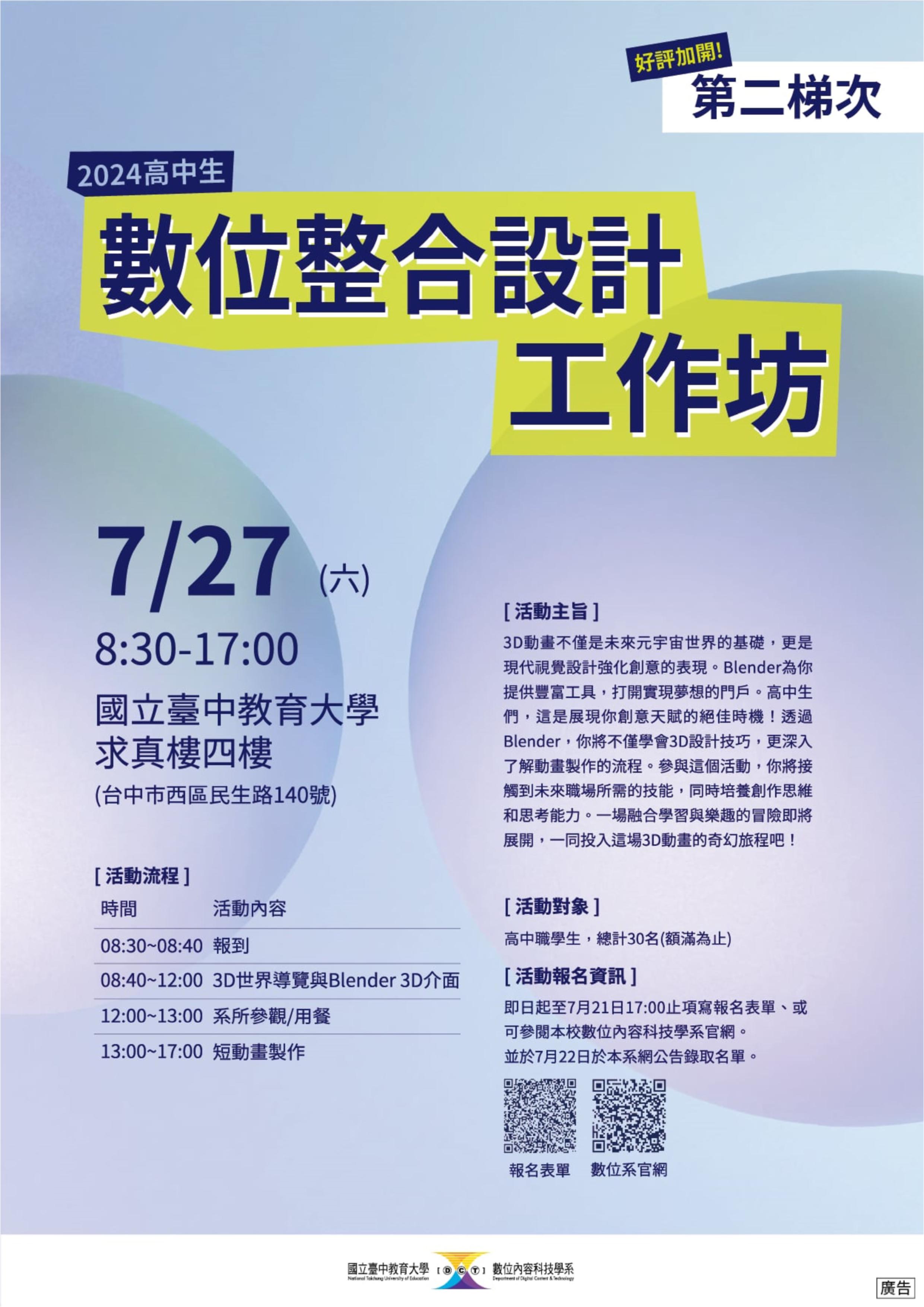 轉知國立臺中教育大學「高中生數位整合設計工作坊」(第二梯次):