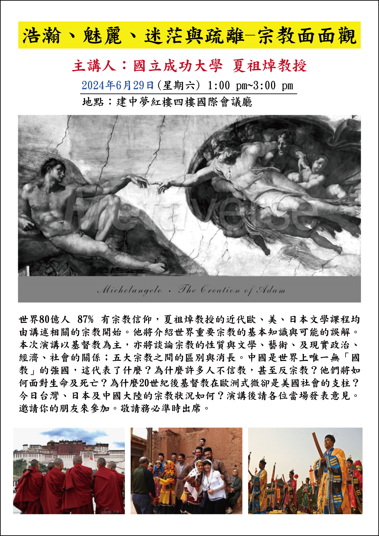 世界80億人87% 有宗教信仰,夏祖焯教授的近代歐、美、日本文學課程均由講述相關的宗教開始。他將介紹世界重要宗教的基本知識與可能的誤解。本次演講以基督教為主,亦將談論宗教的性質與文學、藝術、及現實政治、經濟、社會的關係;五大宗教之間的區別與消長。